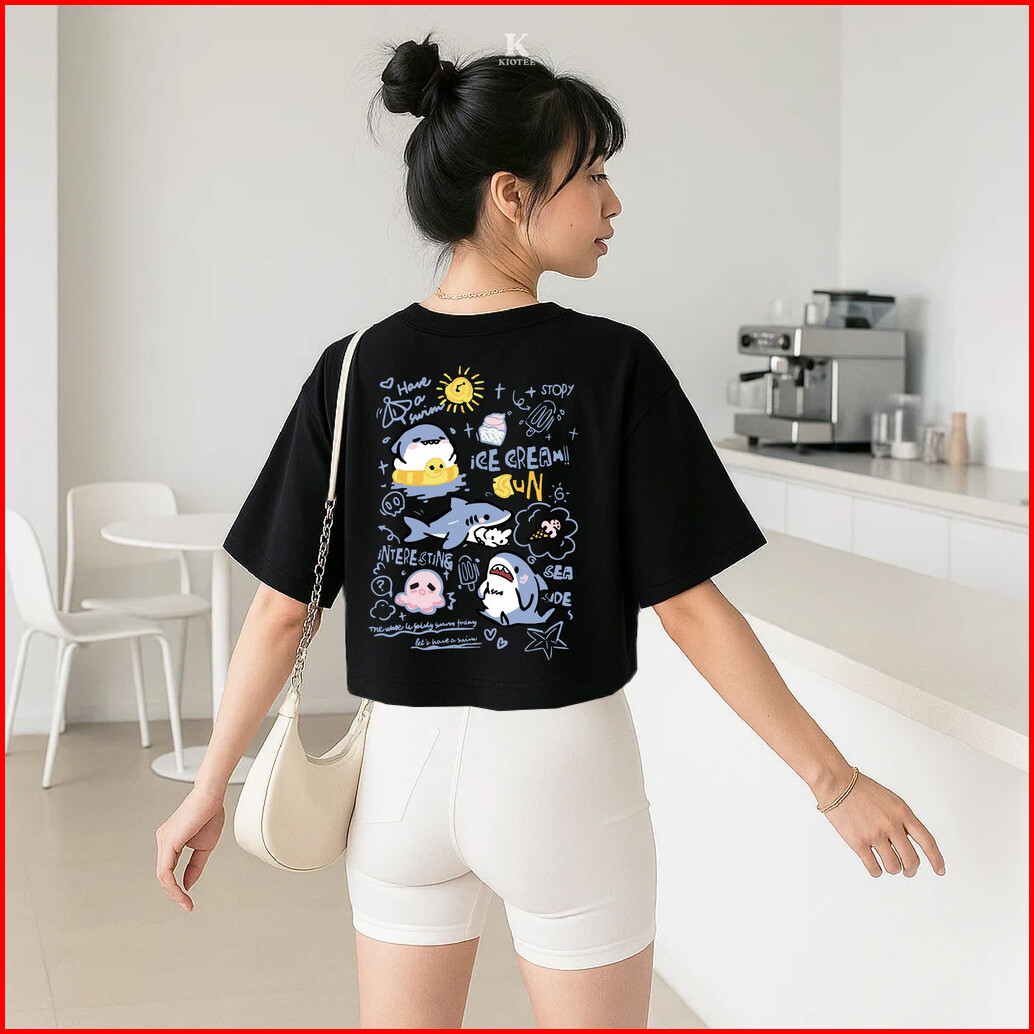 Kioteeshop Baju Kaos Oversize Atasan Kaos Crop Top Oversize Lengan Pendek Motif Shark