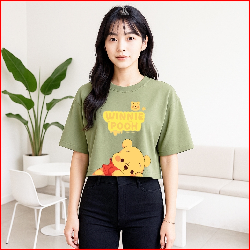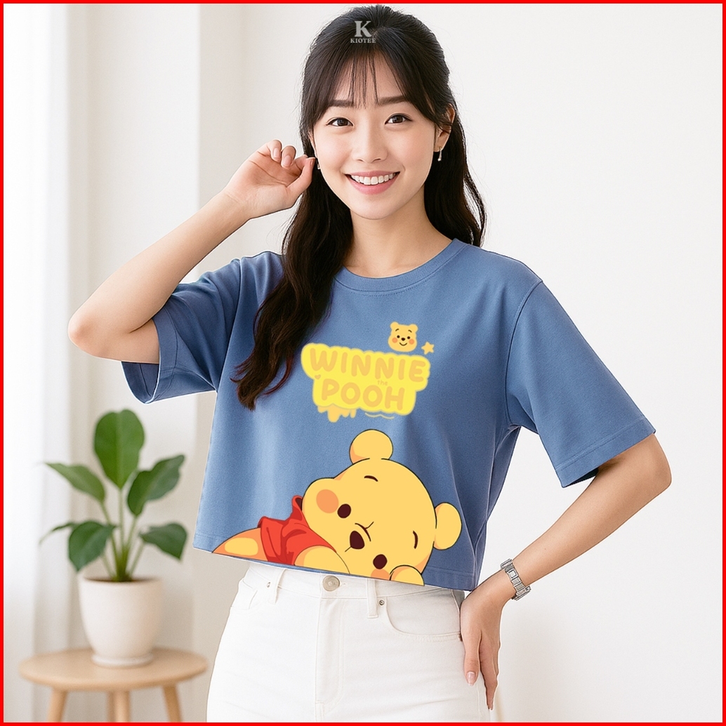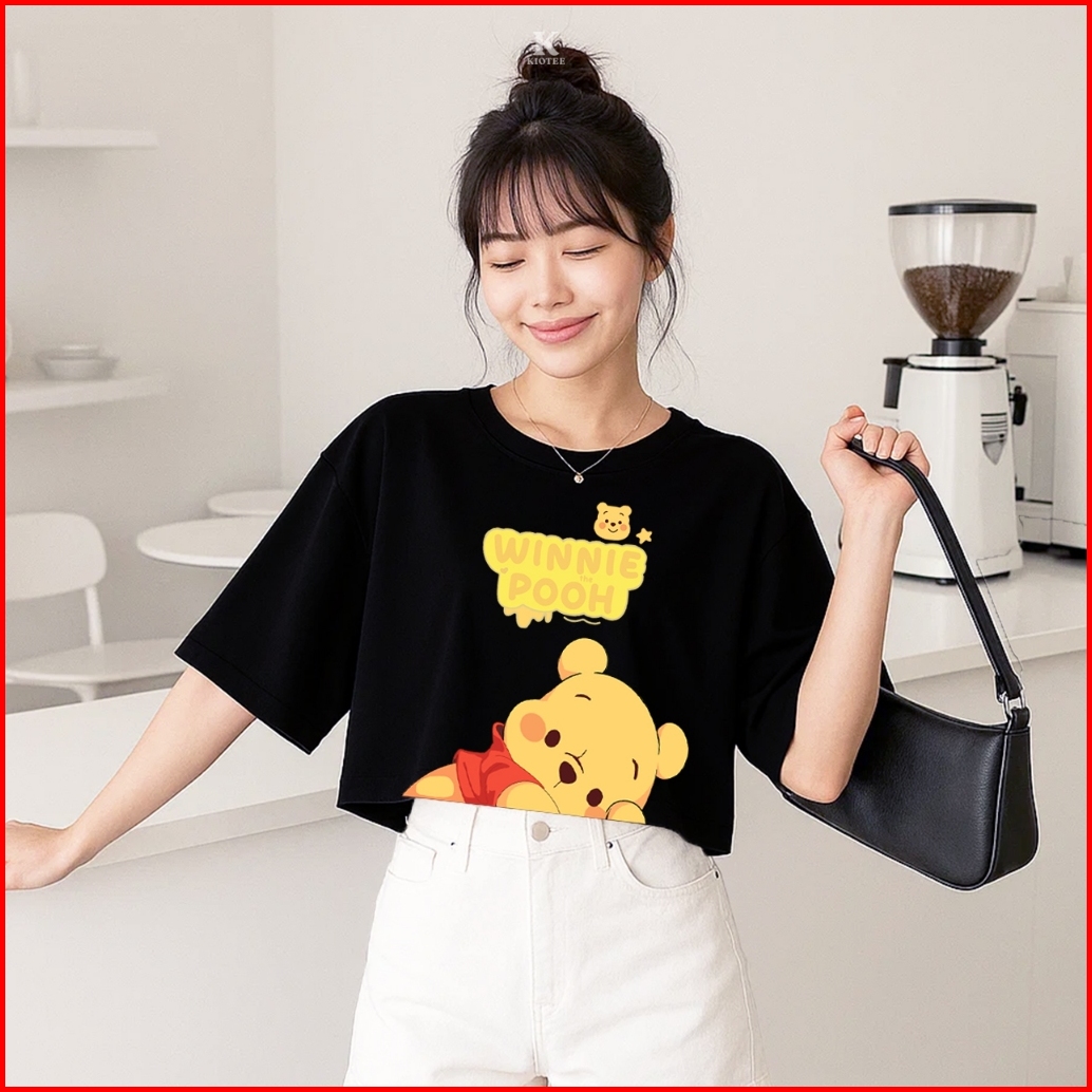 Kioteeshop Baju Crop Top Oversize Lengan Pendek Bahan Kaos Katun Winnie The Pooh Tidur