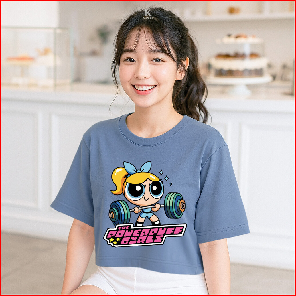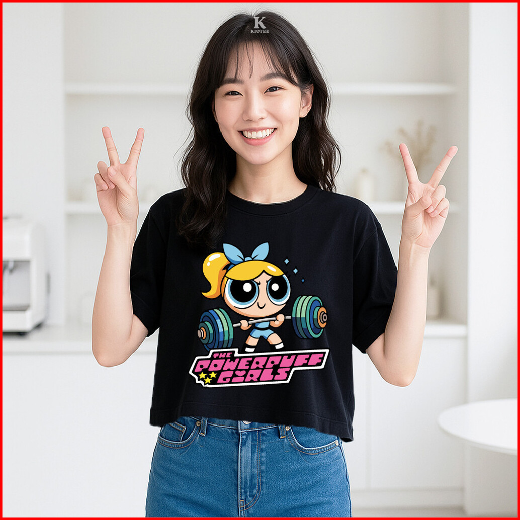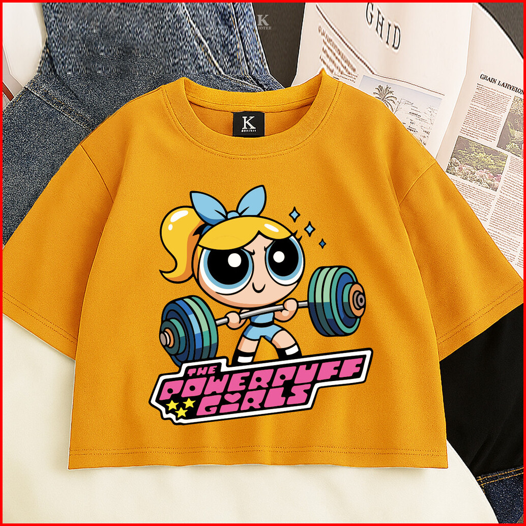 Kioteeshop Baju Kaos Crop Top Bahan Katun Lengan Pendek Motif Powerpuff Olahraga