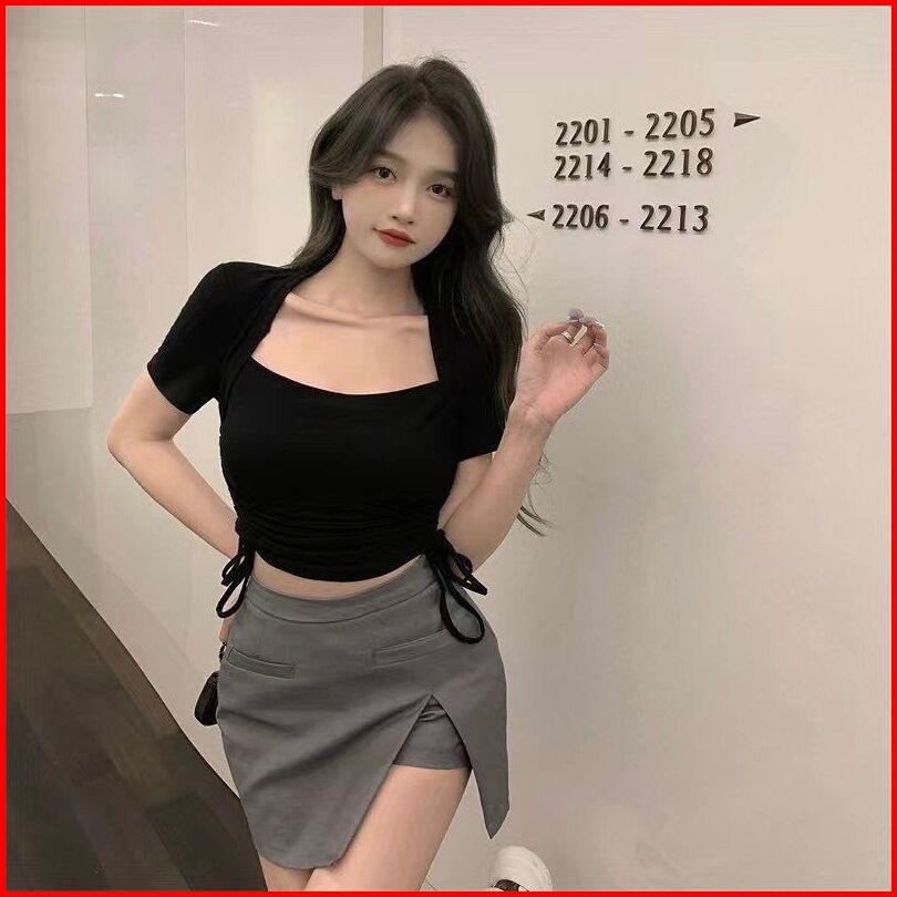 Crop Top Serut Lengan Pendek Wanita - Atasan Kaos Wanita Fashion Korea 6046