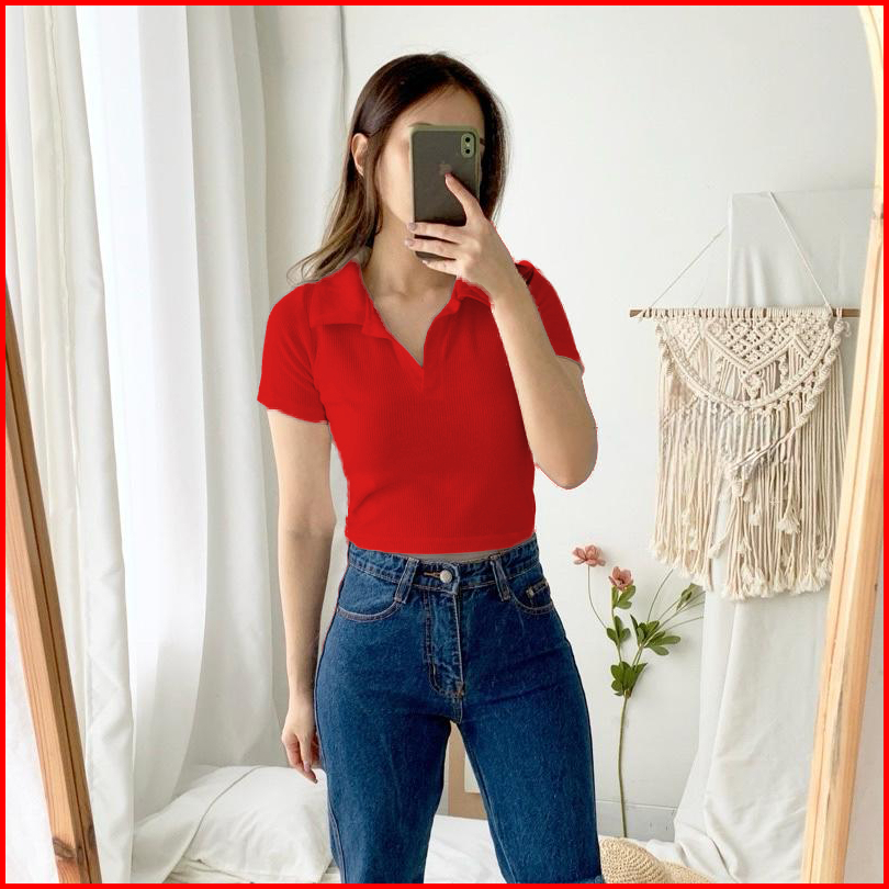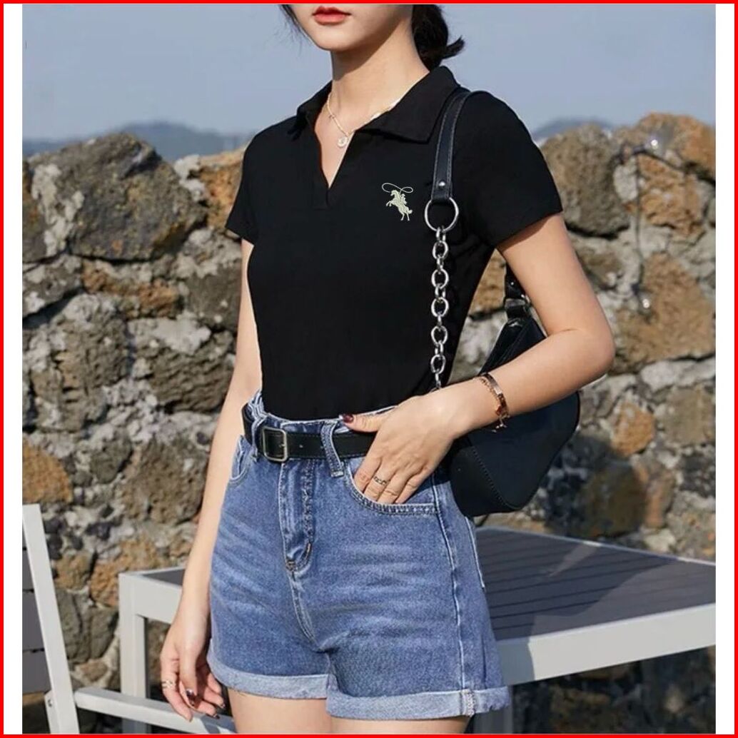 Crop Top Embroidery Regular Lengan Pendek - Atasan Wanita Bordir Kuda V-neck Kerah V 6078
