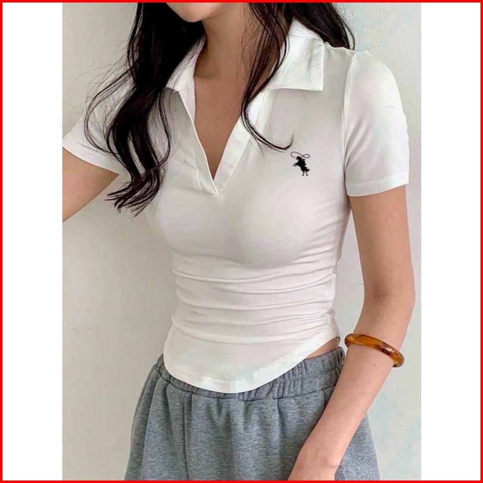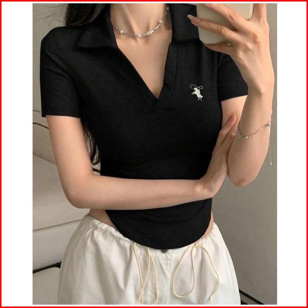 Atasan Kaos Kerah V Crop Top Lengan Pendek - Kaos Crop Bordir Kuda Tali Oval Wanita Terbaru 6079