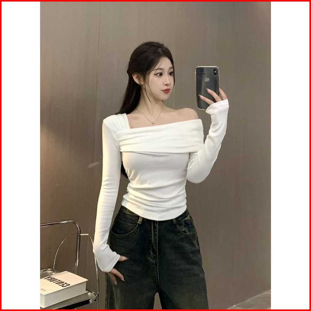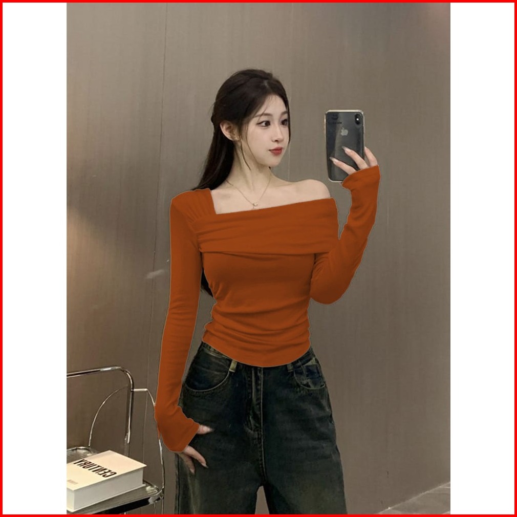 Atasan Crop Lengan Panjang Wanita - Crop Top Knit Off Shoulder Slim Fitting Y2k Korean Style Terbaru 6051