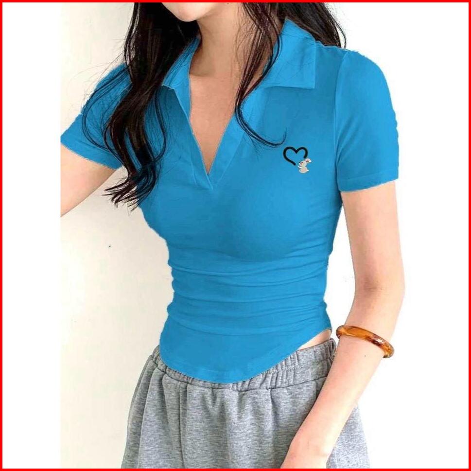 Atasan Wanita Crop Top Bordir Love Rabbit - Kaos Crop V-neck Oval Cute Lengan Pendek Wanita 6074