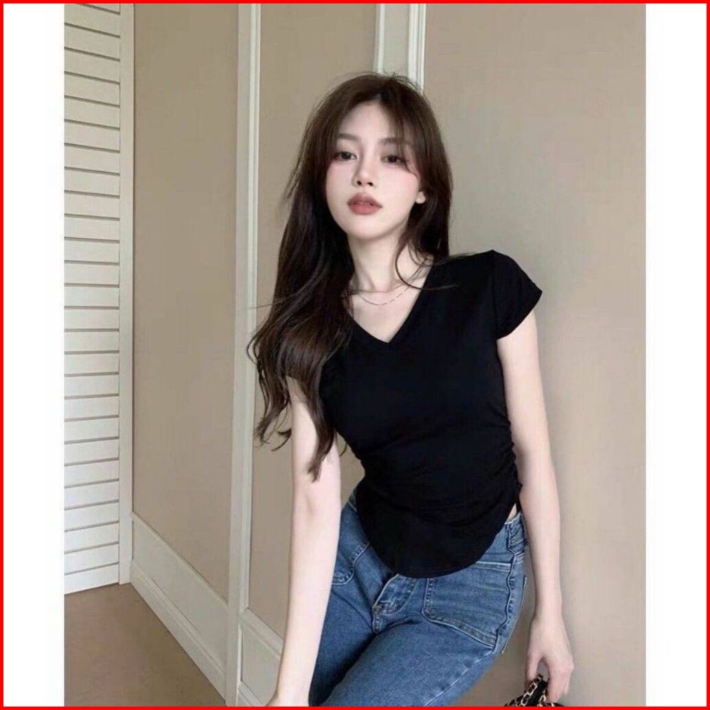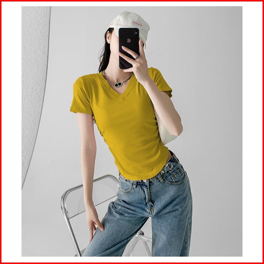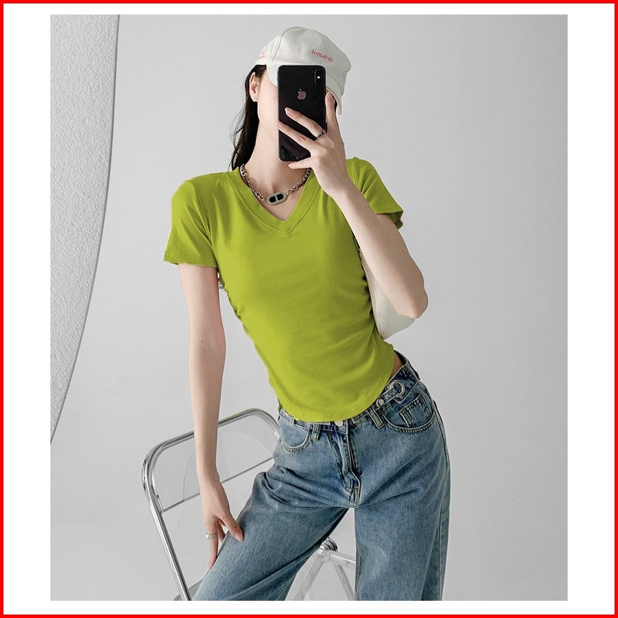 Crop Top V-neck Oval Kerut Samping - Baju Atasan Korean Crop Top Lengan Pendek Wanita 6038