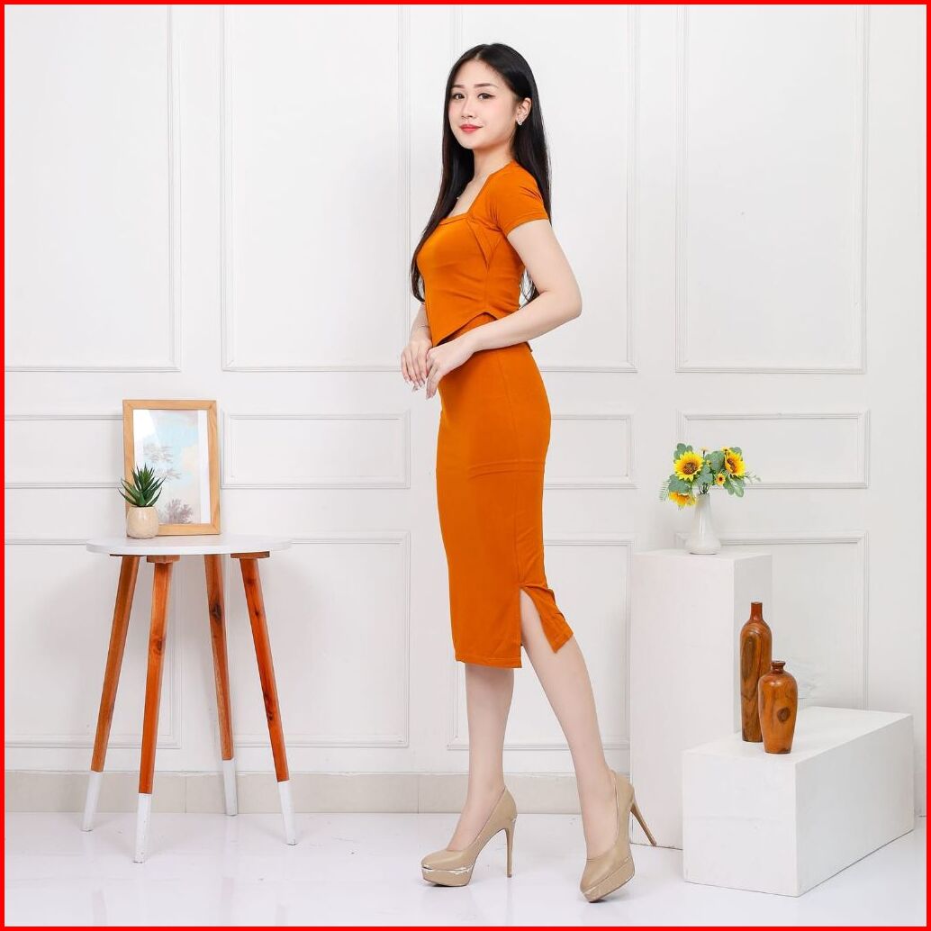 Setelan Crop Top Square Neck Oval Rok Midi Bodycon Belah Samping - Set Korean Style 032