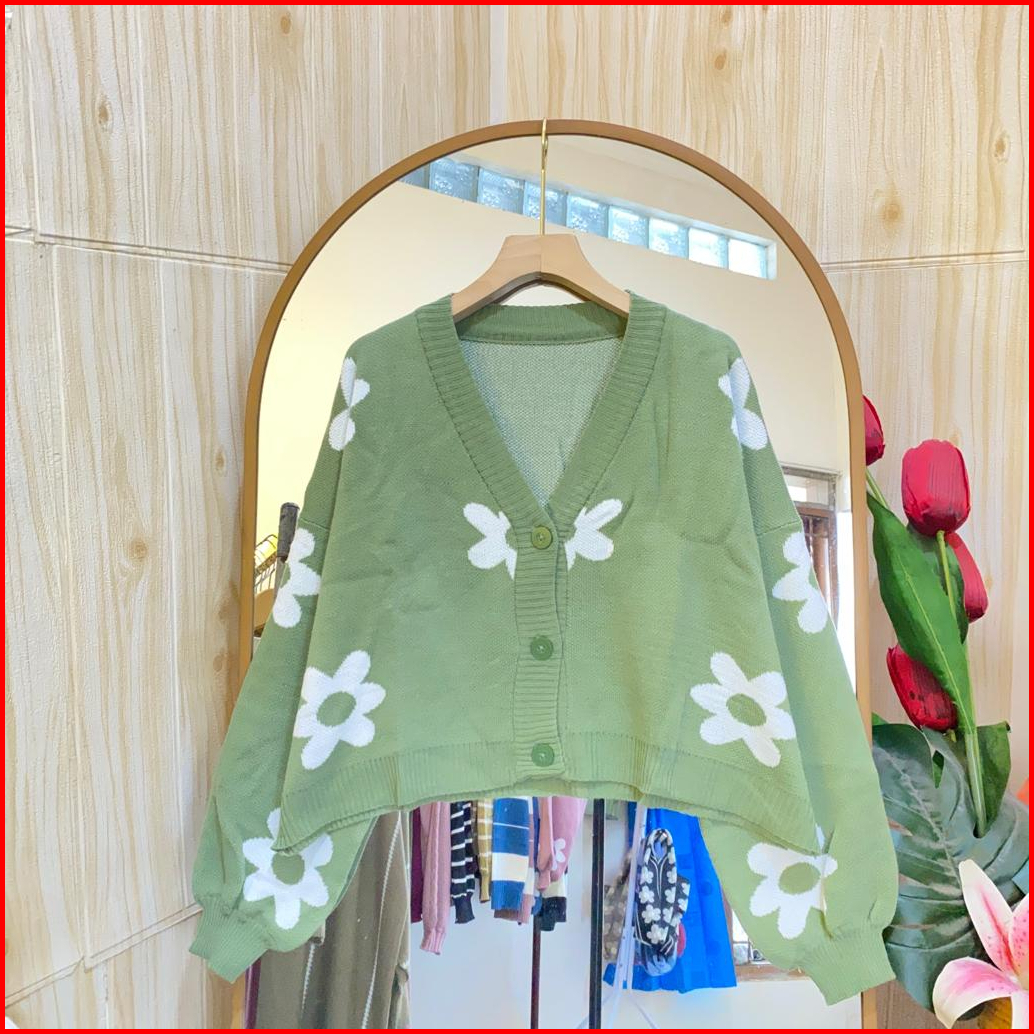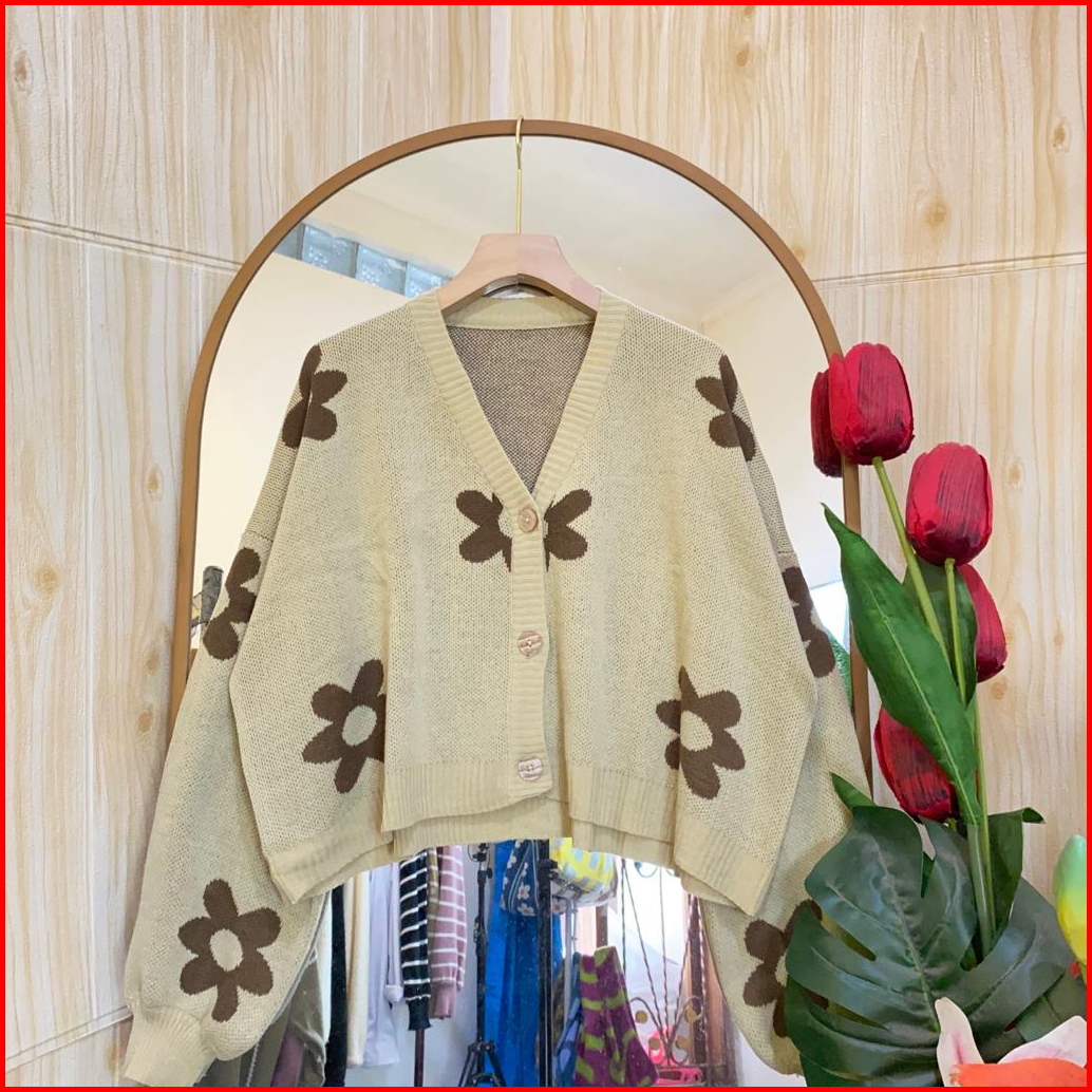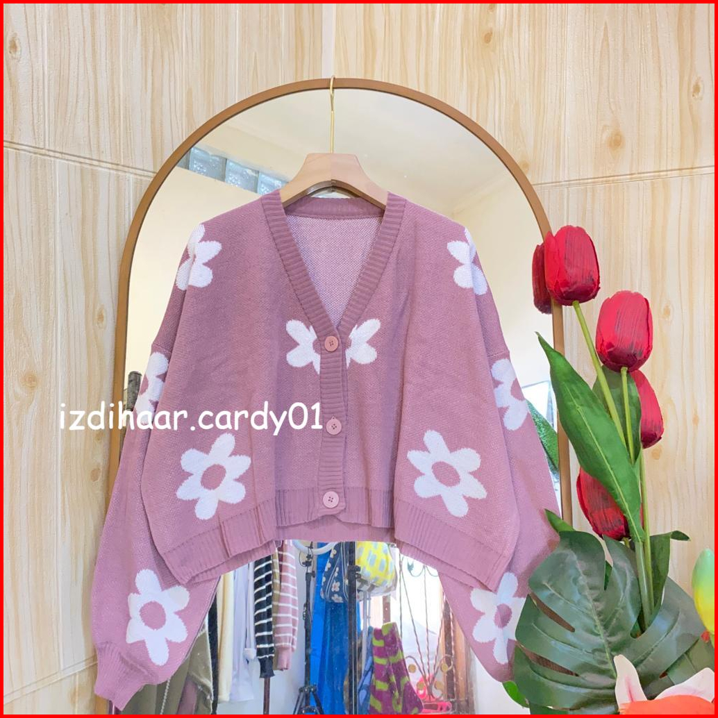 Nadya Crop Cardigan Oversize Rajut Wanita Motif Bunga Full Kancing