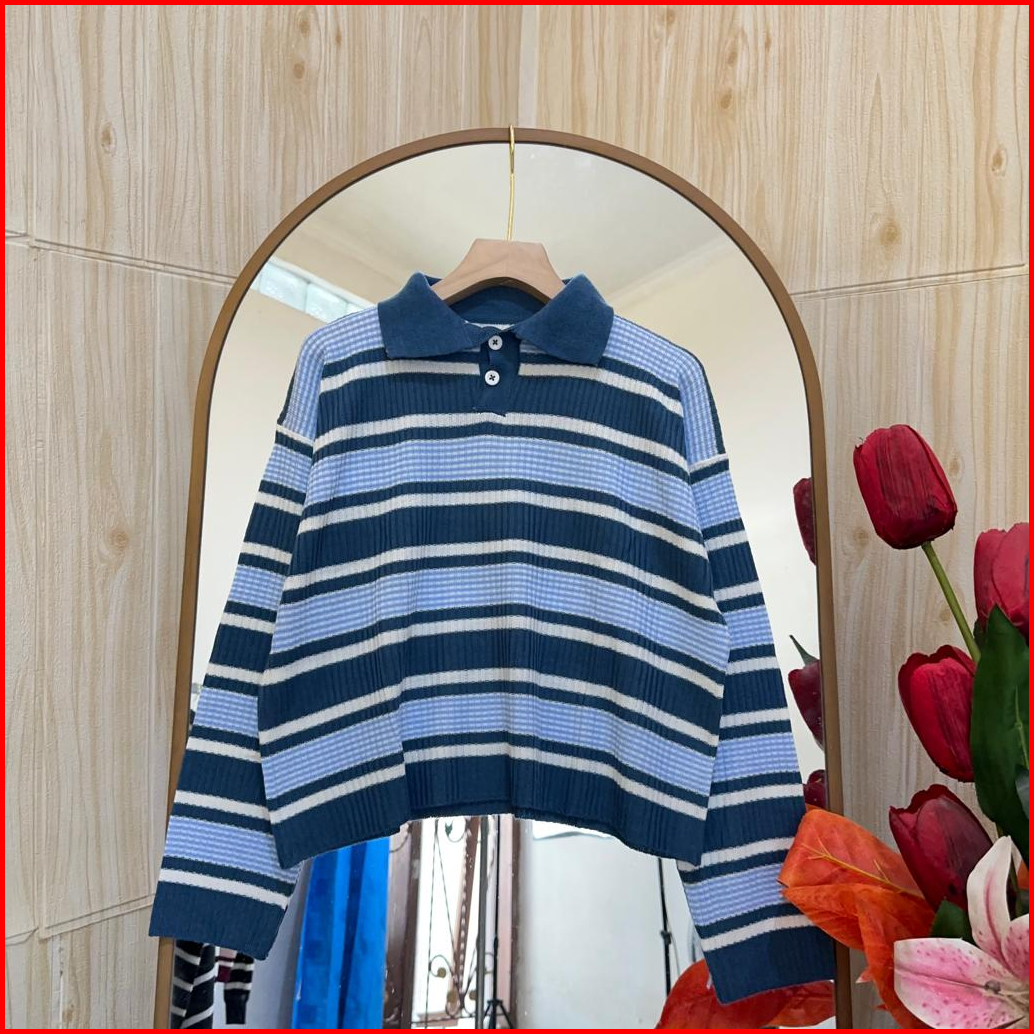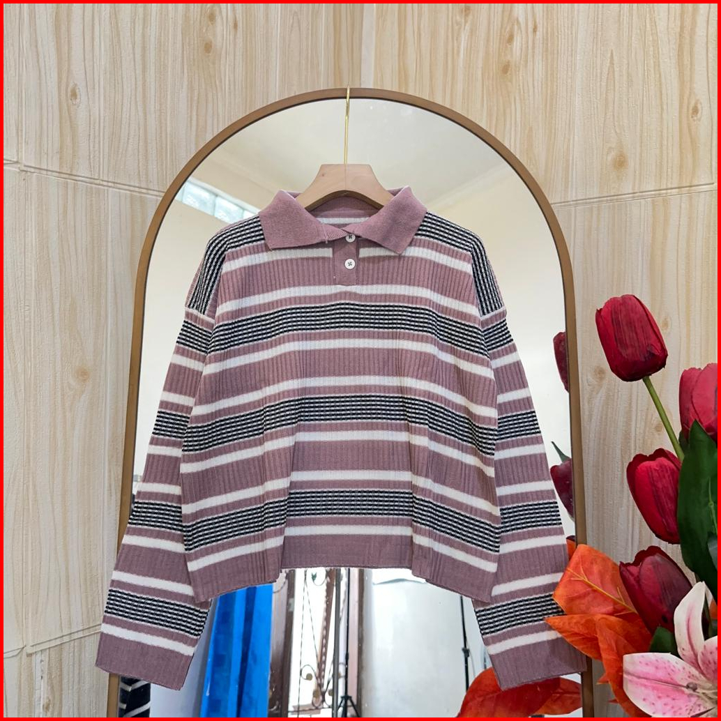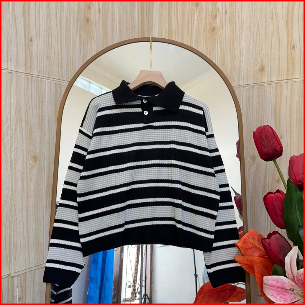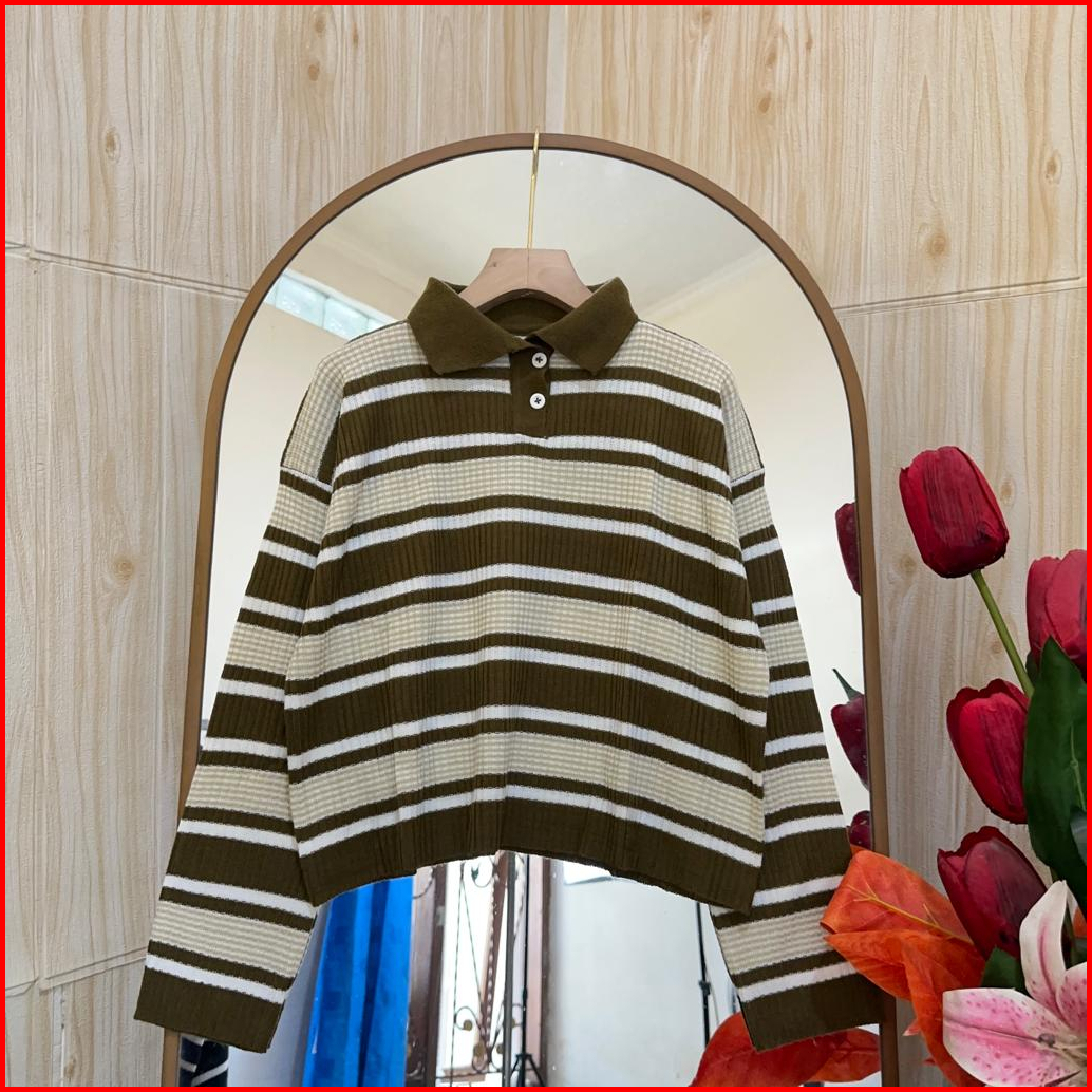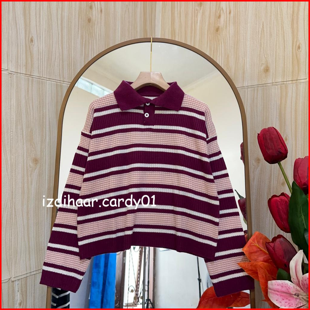 Zaviya Polo Crop Atasan Wanita Rajut Lengan Panjang Bergaris