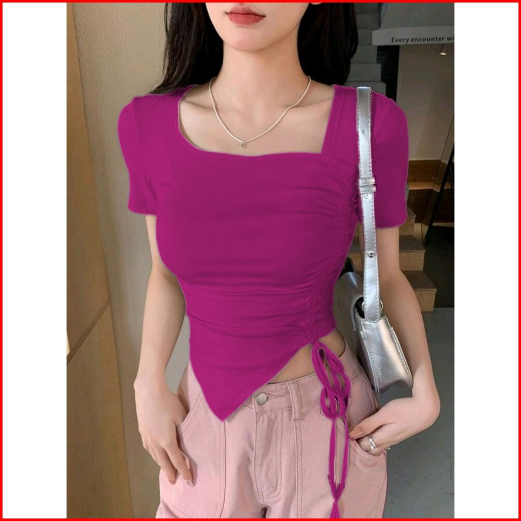 Crop Top Square Neck Tali Serut Samping Lengan Pendek - Kaos Wanita Korean Crop Top Terbaru 6058