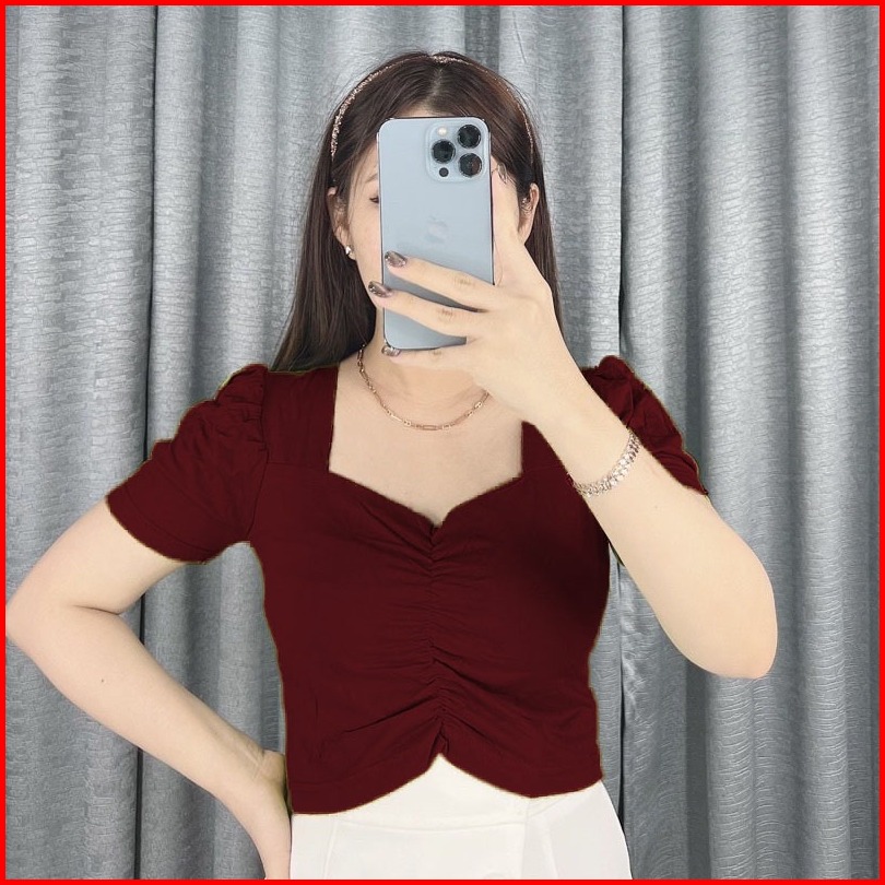 Crop Top Blouse Wanita Kerut Tengah Korea - Baju Crop Top Polos Wanita Spandek Import 6010