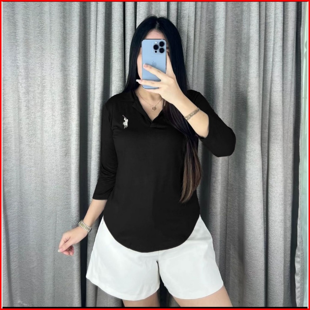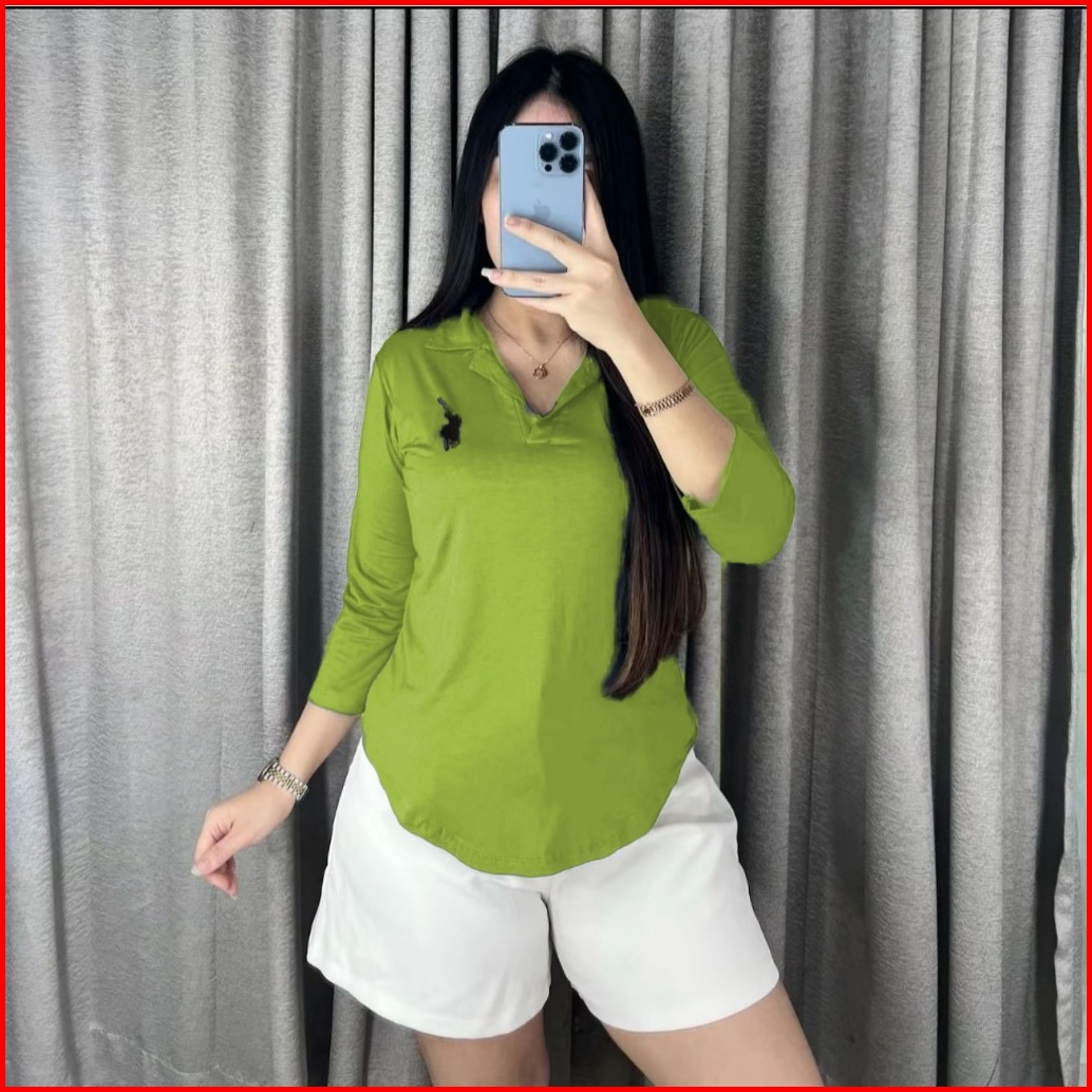 Karina Bordir - Kaos Bordir Kerah V Lengan Panjang 7 8 - Atasan Polo Oversize Berkerah Wanita 6073