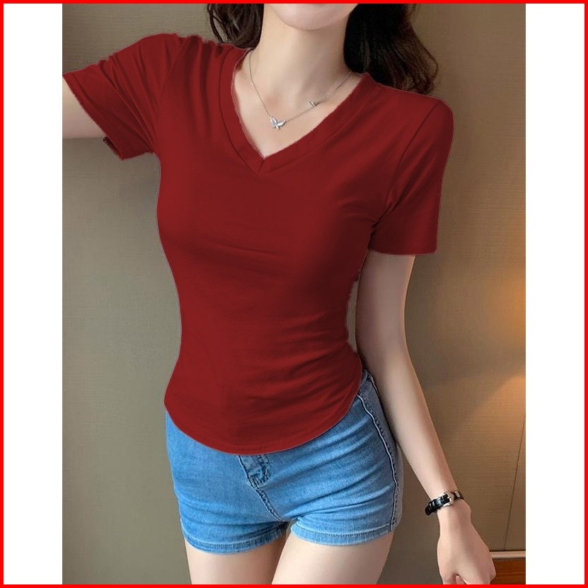 Kaos V-neck Oval Polos Wanita - Kaos Vneck Lengan Pendek Korean Style 6028