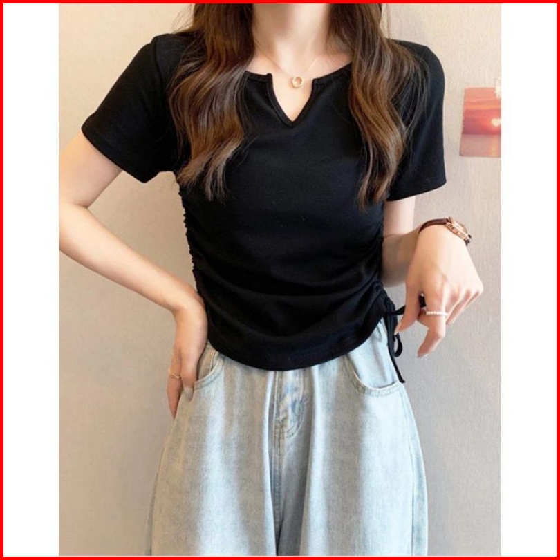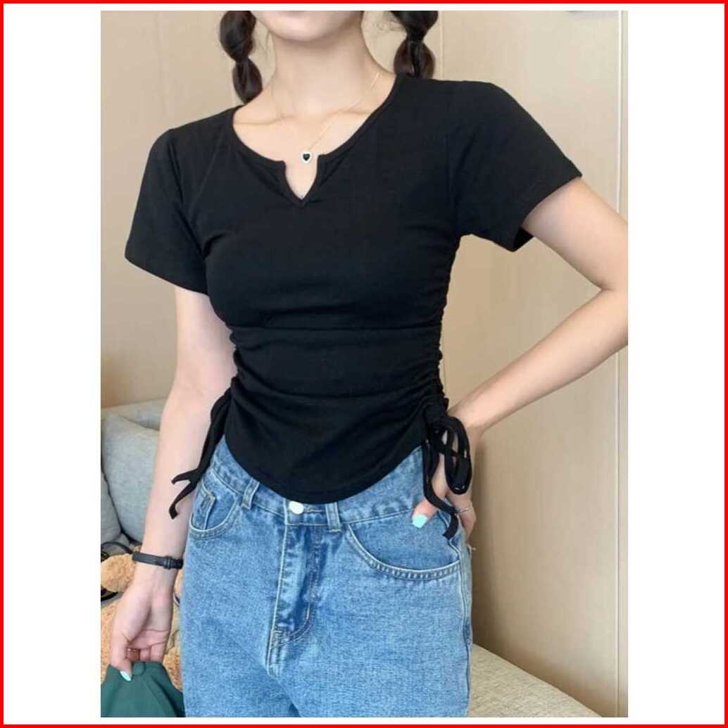 Kaos V-neck Lengan Pendek Wanita Serut Kiri Kanan - Baju Atasan Crop Wanita Korean T-shirt 2 Model