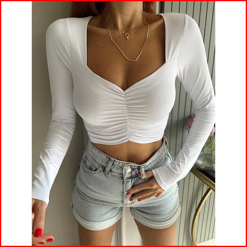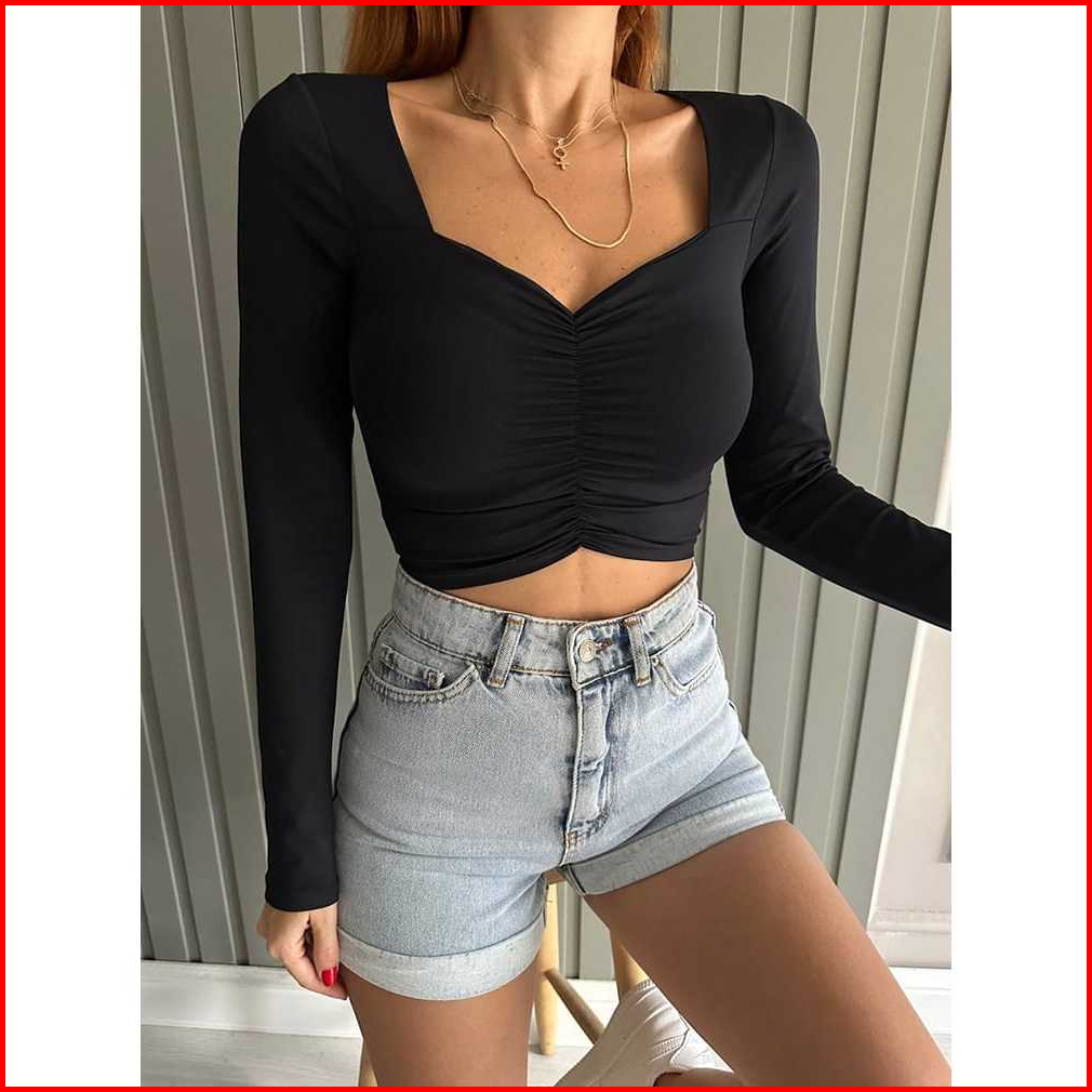 Atasan Crop Top Lengan Panjang Wanita Kerut Tengah Korea - Baju Crop Top Polos Wanita 6056