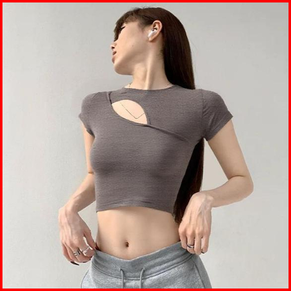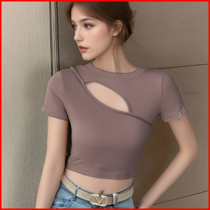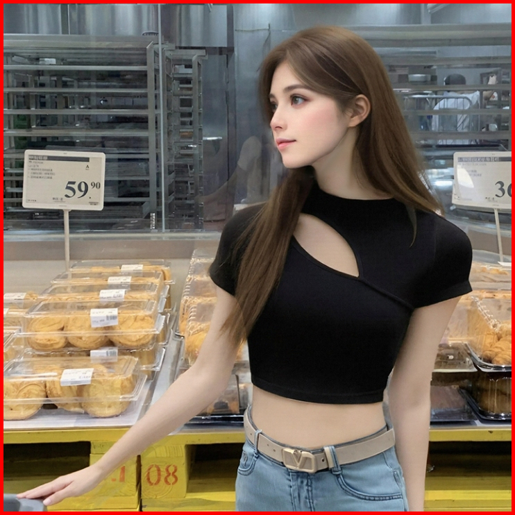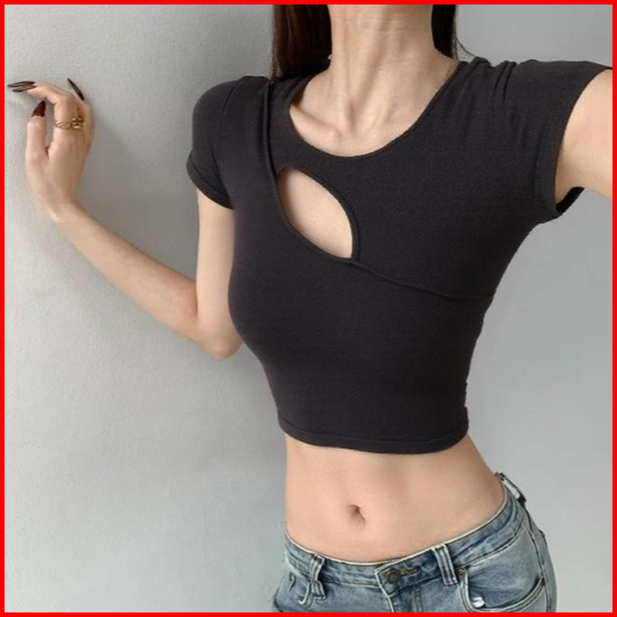 99koutlet Atasan Wanita Crop Top Lengan Pendek Cut Out Crew Neck Korean Style Polos S M L Xl 3341 Kaos Hitam Putih T-shi