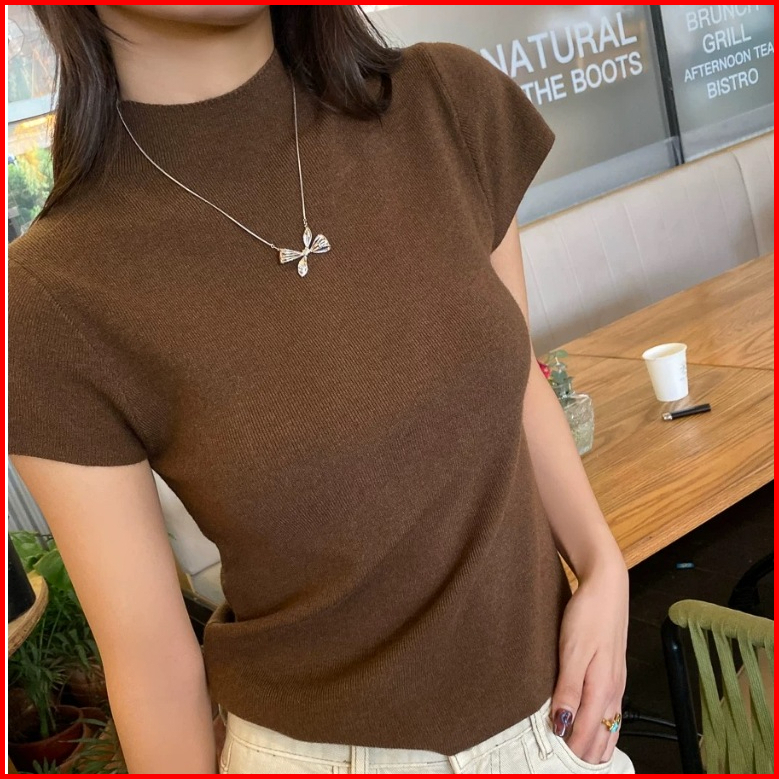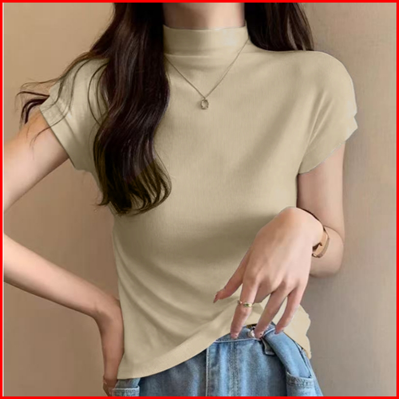 Premium Women S Semi-high Neck Short Sleeve T-shirt Solid Color Basic Tee 7629 S M L