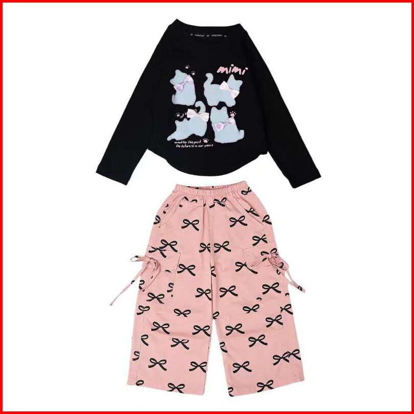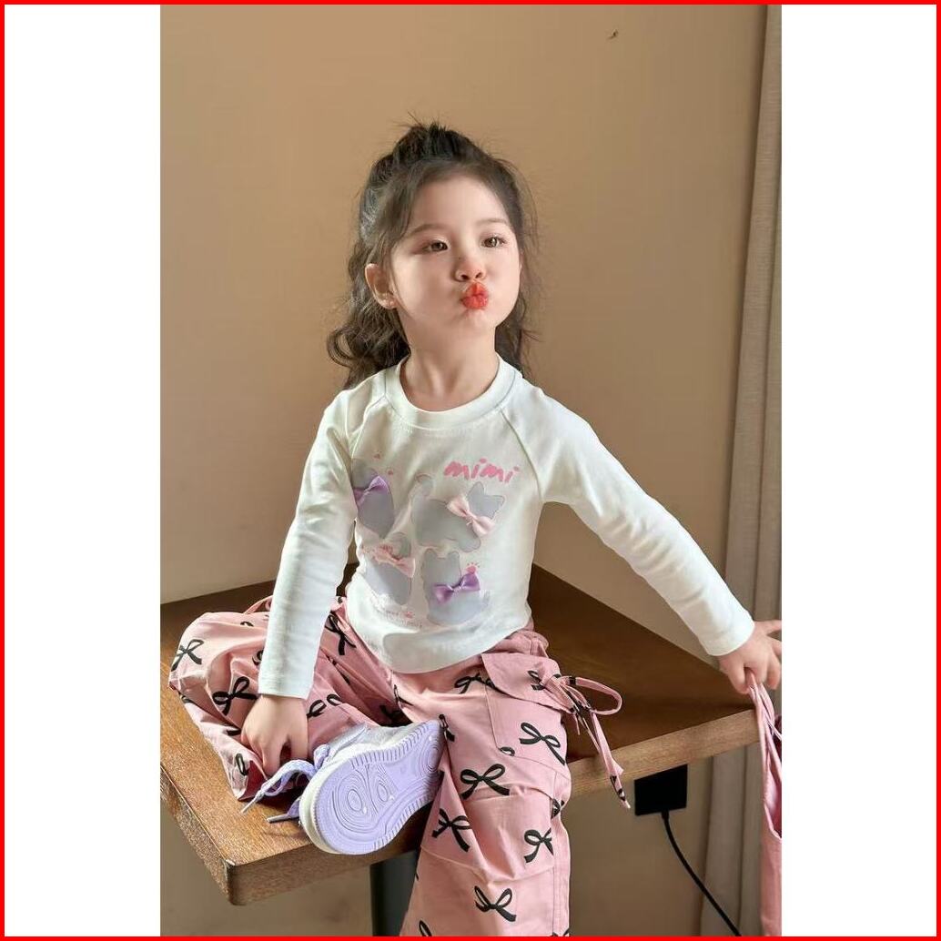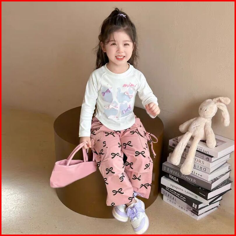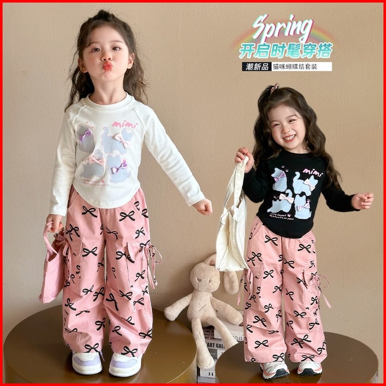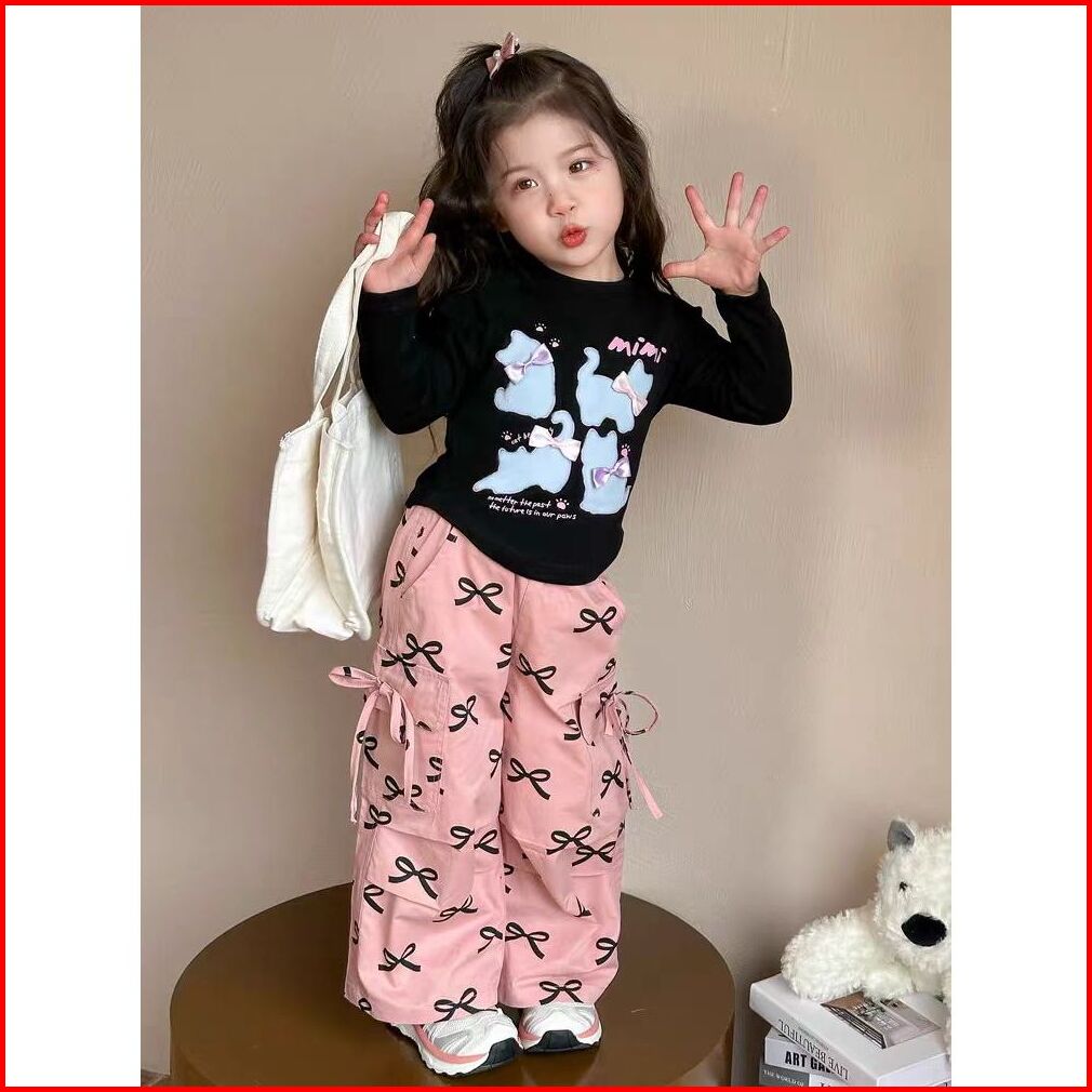 Baju Set Anak Perempuan Lucu 1-5 Tahun Kaos Lengan Panjang Motif Kucing Celana Cargo Motif Pita