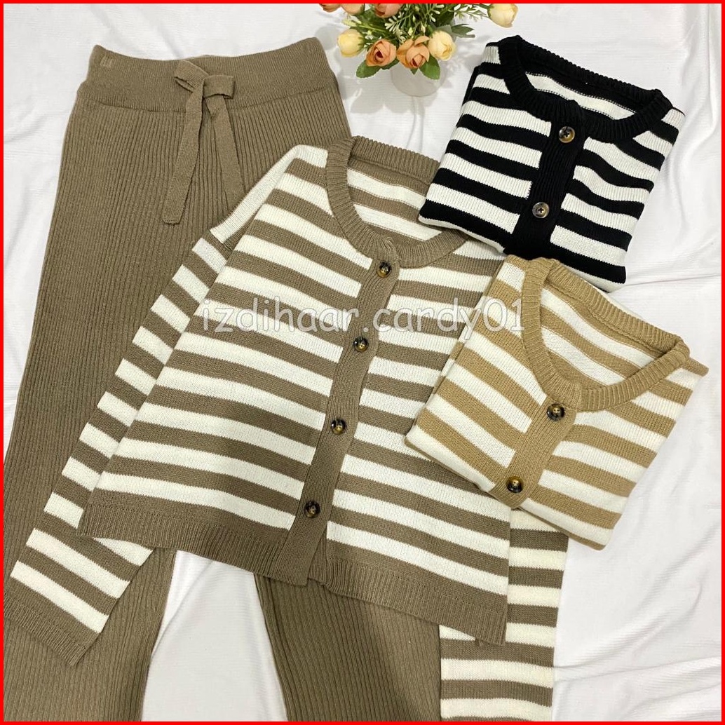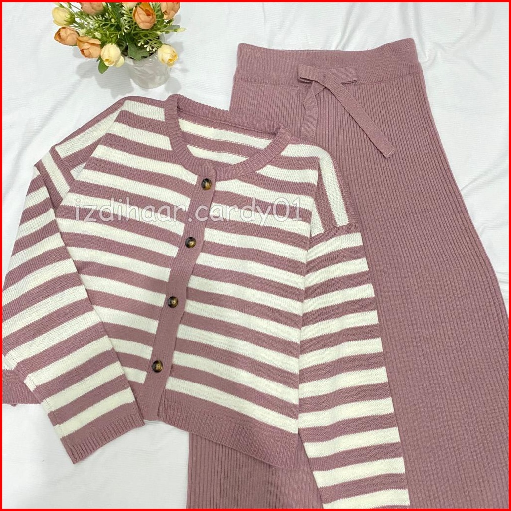 One Set Alea Crop Cardy Rajut Garis-garis Terbaru