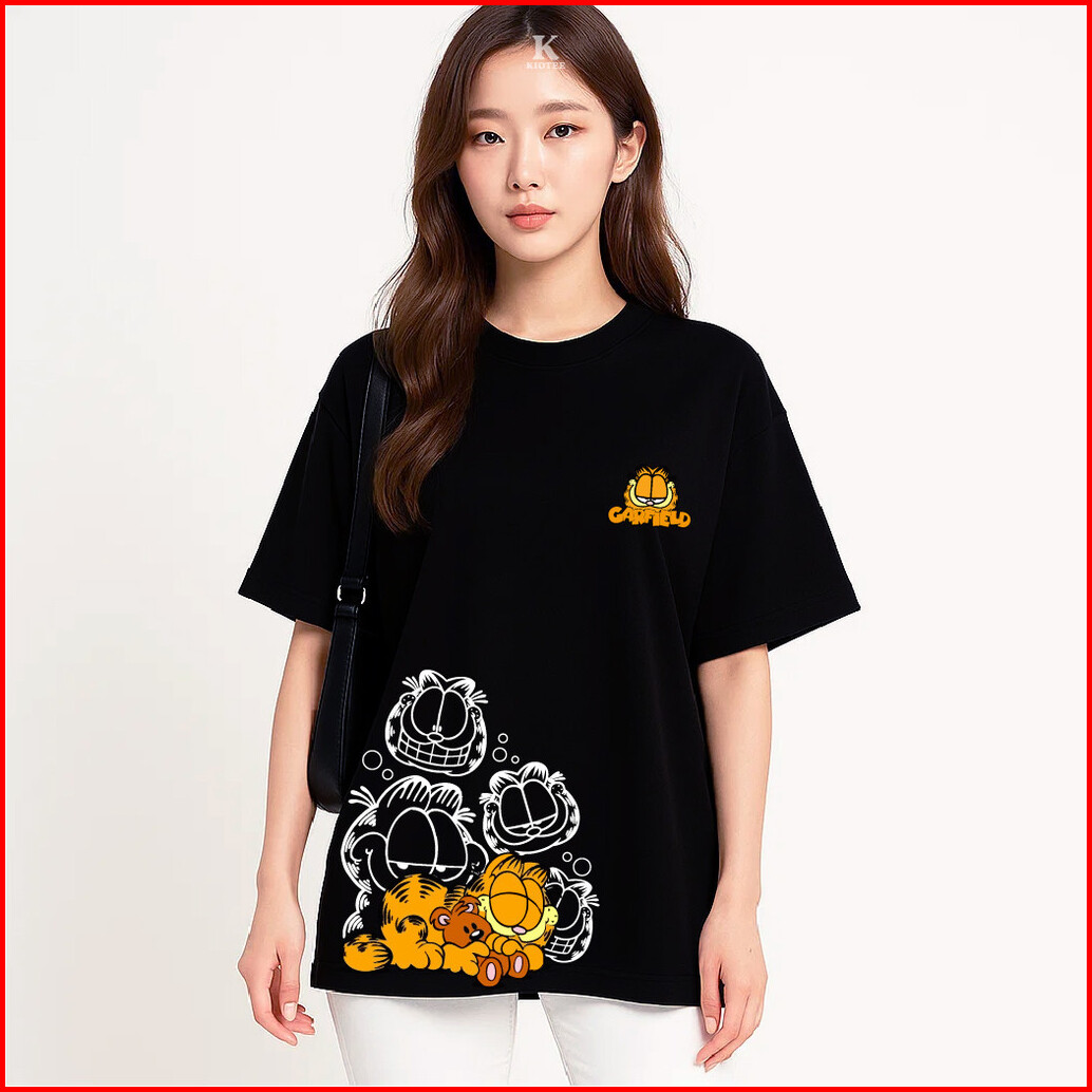 Kioteeshop Kaos Oversize Lengan Pendek Couple Cewek Cowok Kaos Crop Top Bahan Katun Motif Garfield Samping Depan Putih