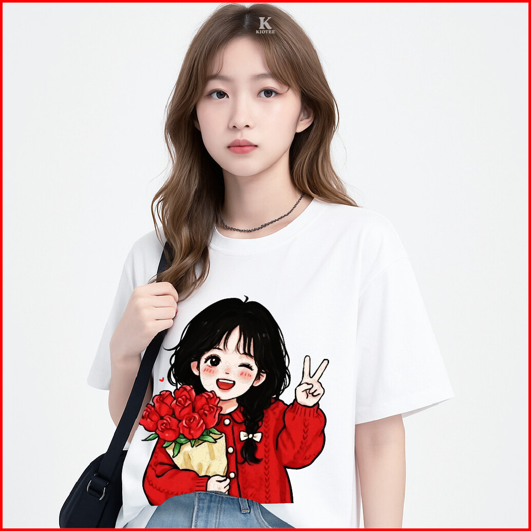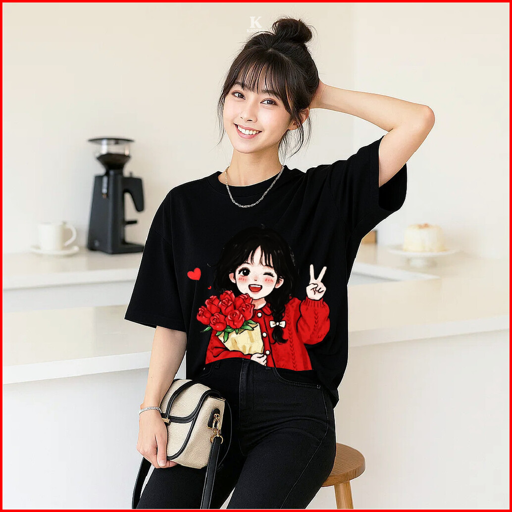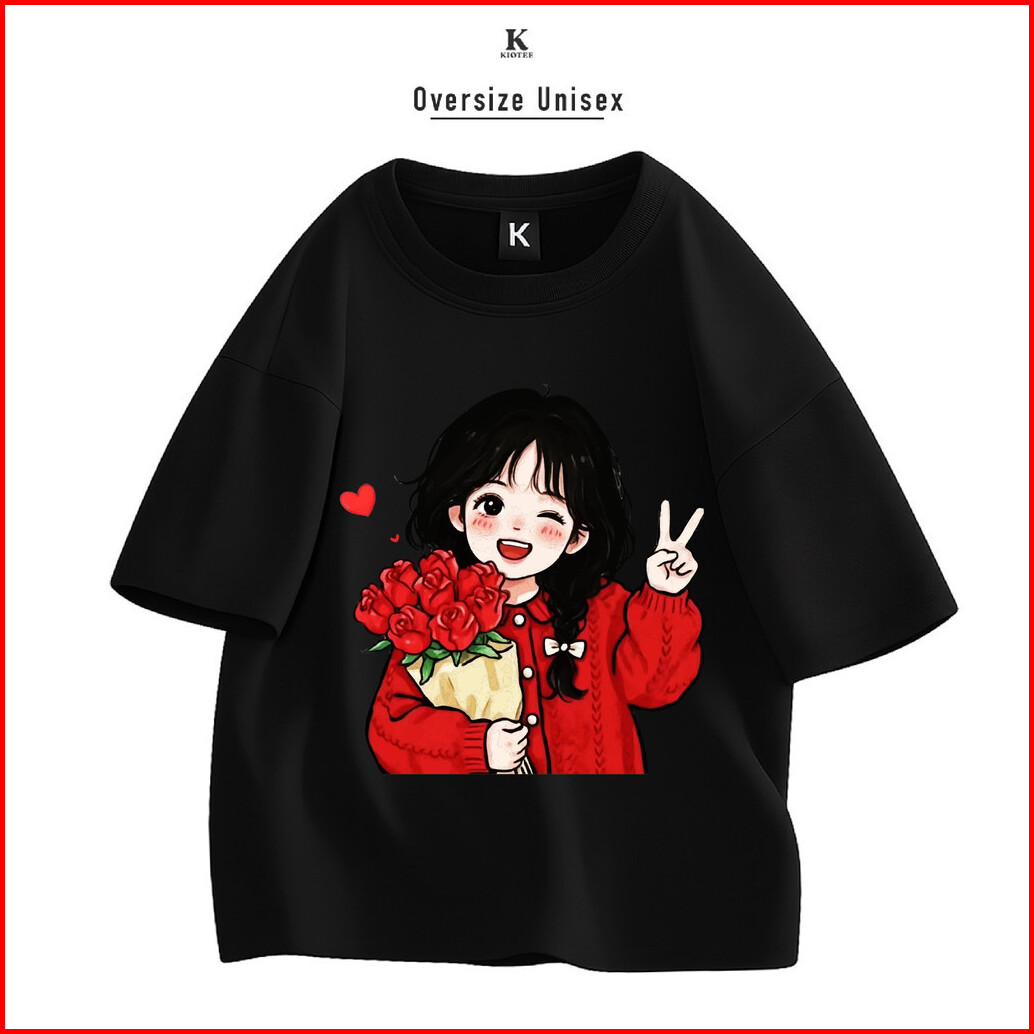 Kioteeshop Kaos Oversize Lengan Pendek Couple Cewek Cowok Kaos Crop Top Bahan Katun Motif Cewe Pegang Bunga Merah