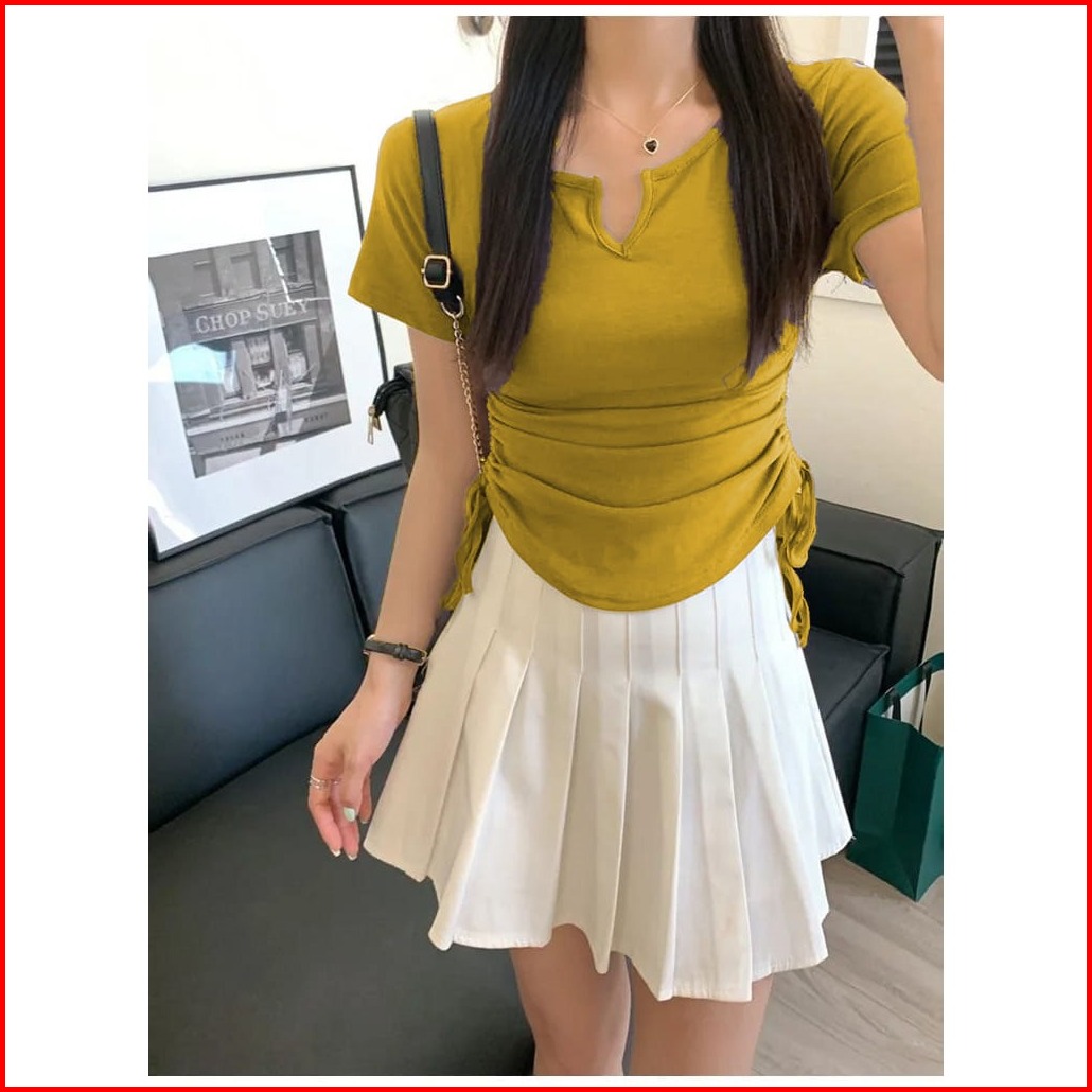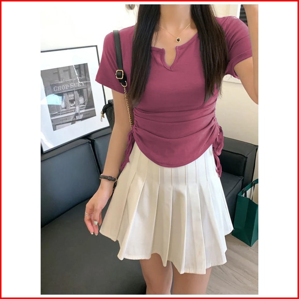 Kaos V-neck Oval Lengan Pendek Wanita Serut Kiri Kanan - Baju Atasan Crop Oval Wanita Korean 6048