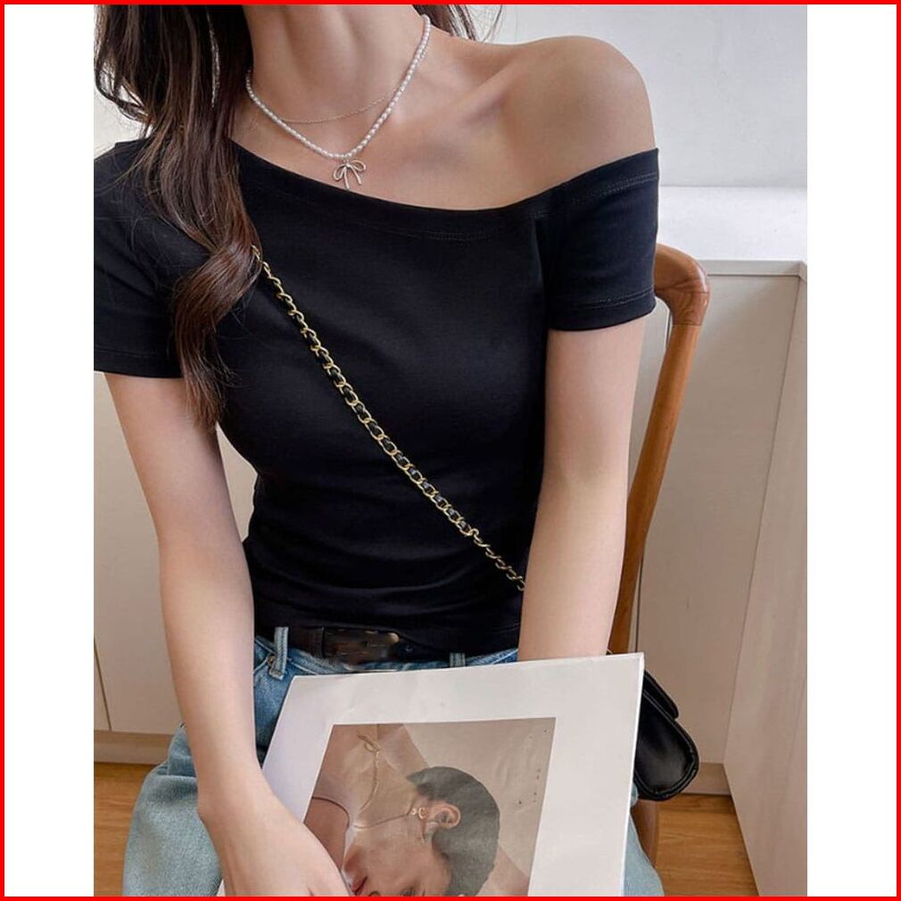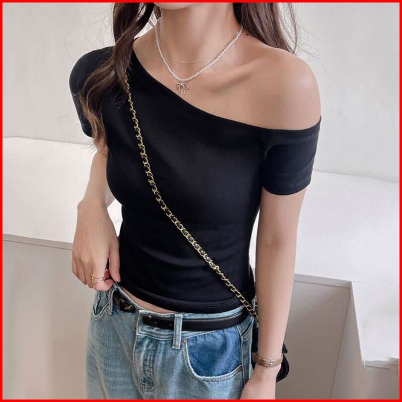 Atasan Crop One Shoulder Wanita - Kaos Sabrina Off Shoulder - Slim Fitting Lengan Pendek Korean 6071