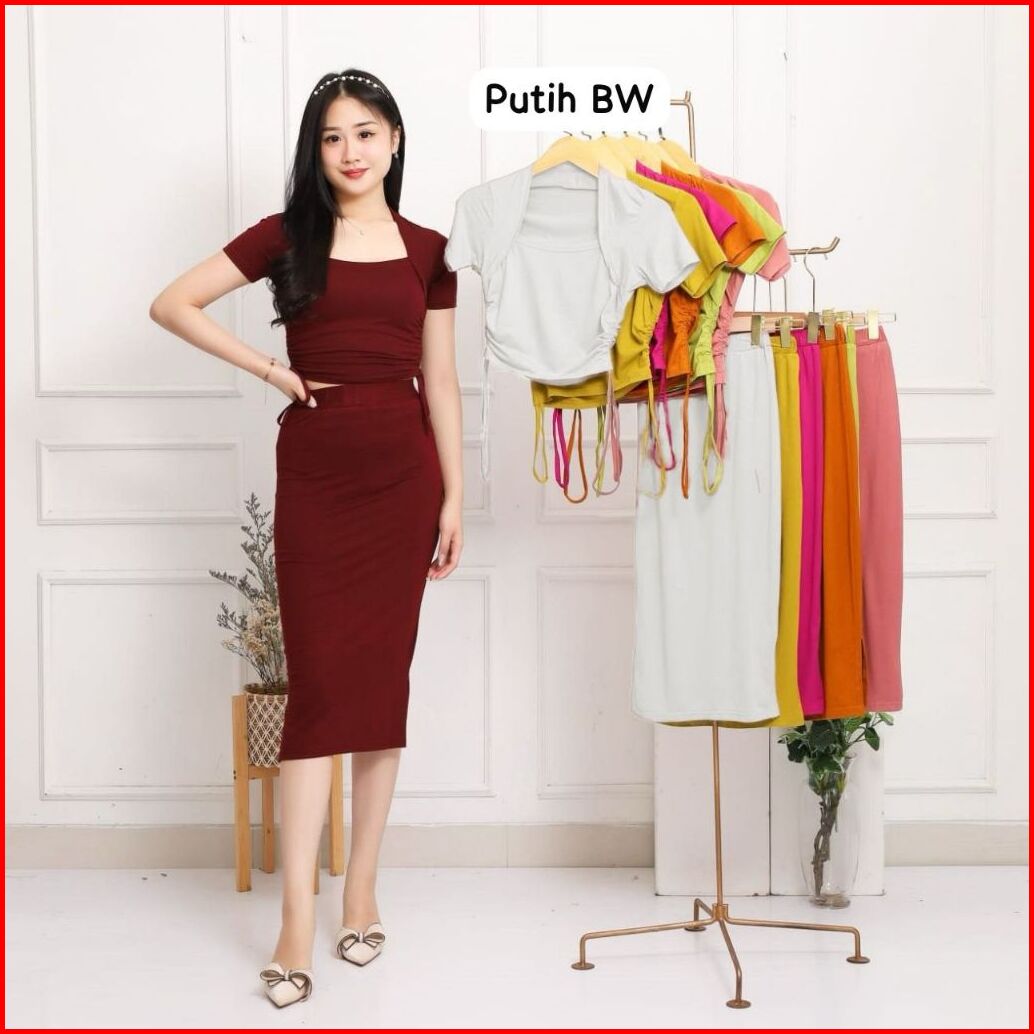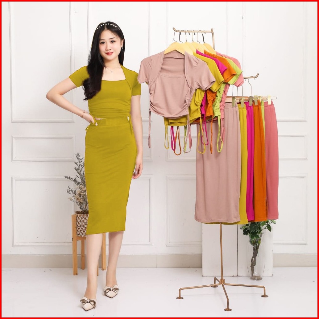 Setelan Rok Crop Top Serut Lengan Pendek - Setelan Wanita Korean Style Terbaru 046 Set