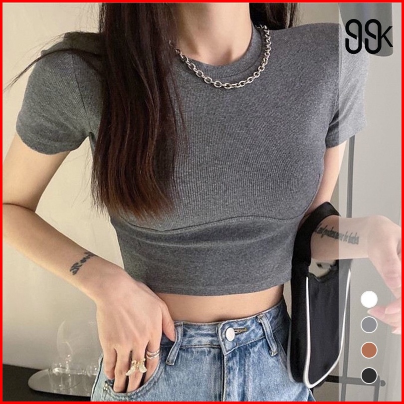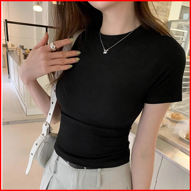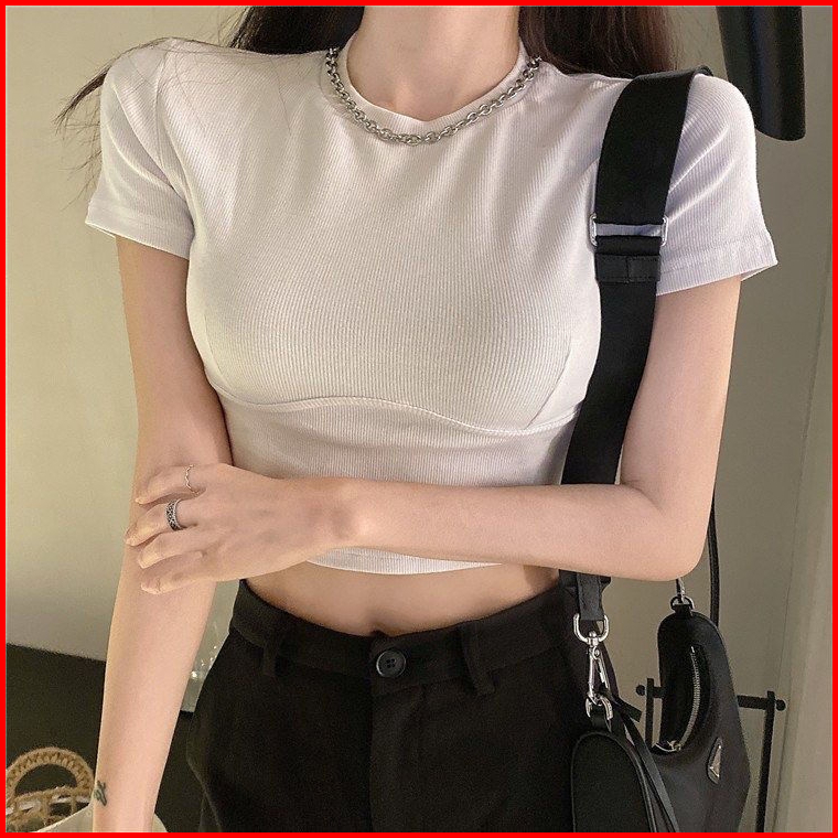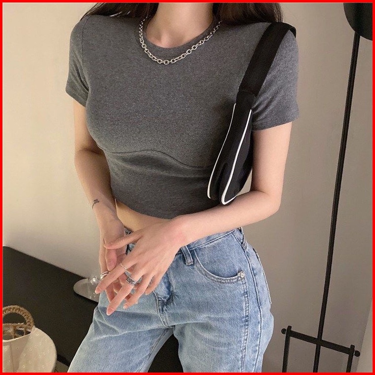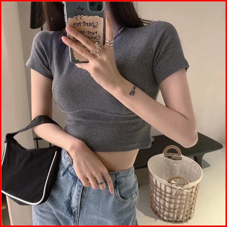 Women Short Sleeve Crew Neck Crop Top Plain 2270