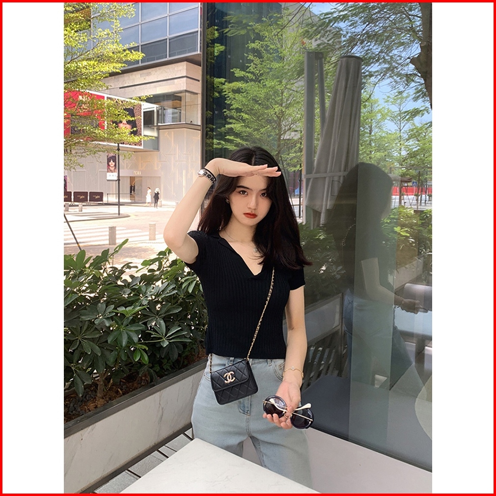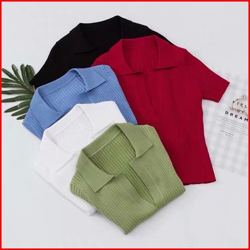 V Neck Short Sleeve Ribbed Crop Polo 2572