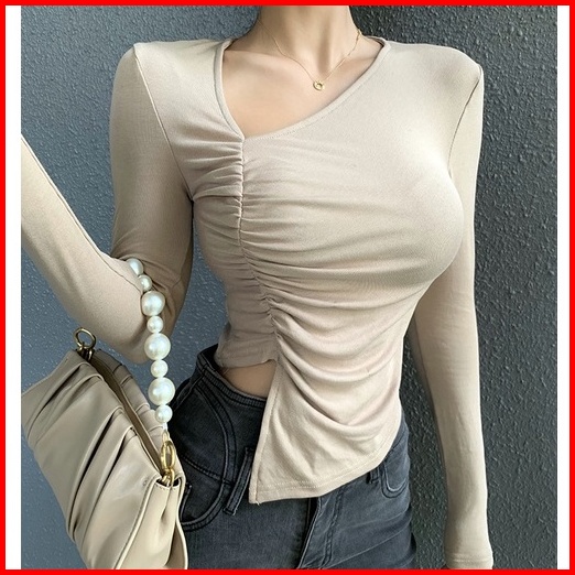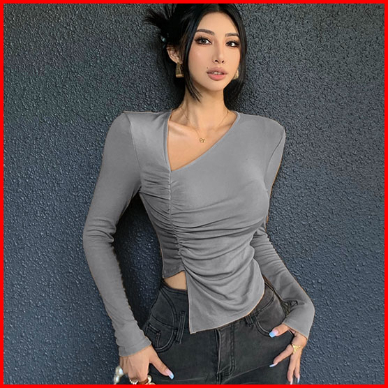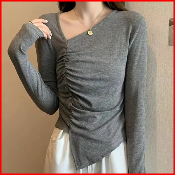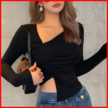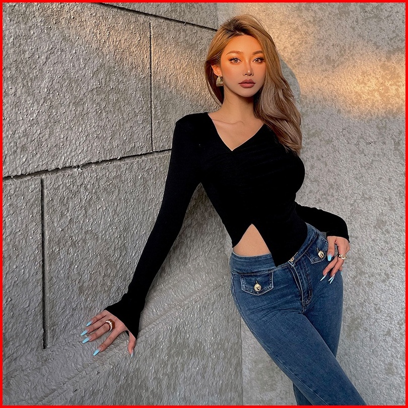 Premium 99koutlet Crop Top Wanita Kaos Wanita Crop Top Asymmetric Long Sleeve Rib S M L 7294 Atasan Wanita Baju Wanita C