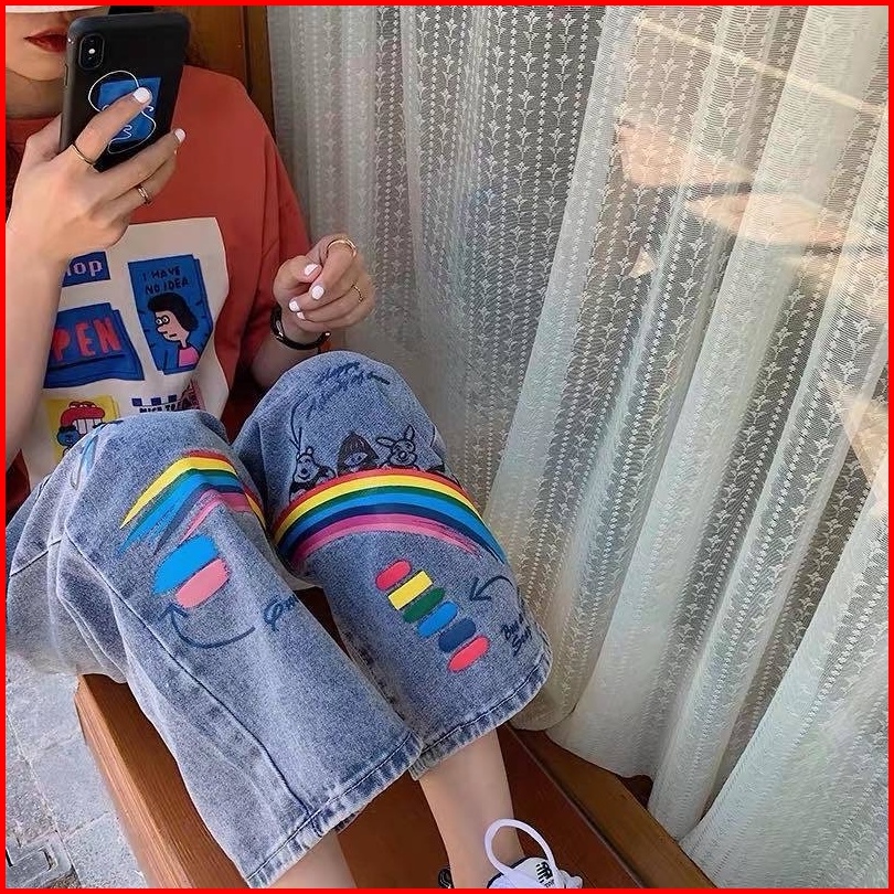 Yuruma Korea Celana Jeans Cetak Lebar Kaki Wanita Pinggang Tinggi Slim Grafiti Pasangan Celana Longgar Lurus