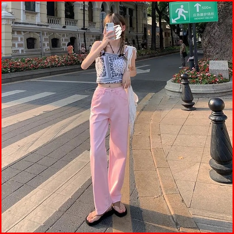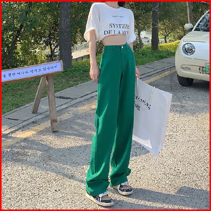 Yuruma Warna Celana Jeans Pinggang Tinggi Wanita Tren Baru Celana Jeans Longgar Lurus Tipis Kaki Lebar