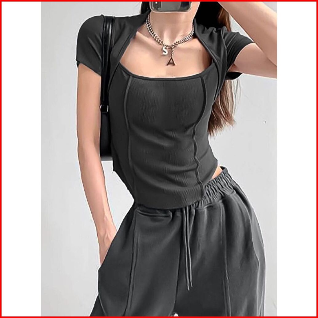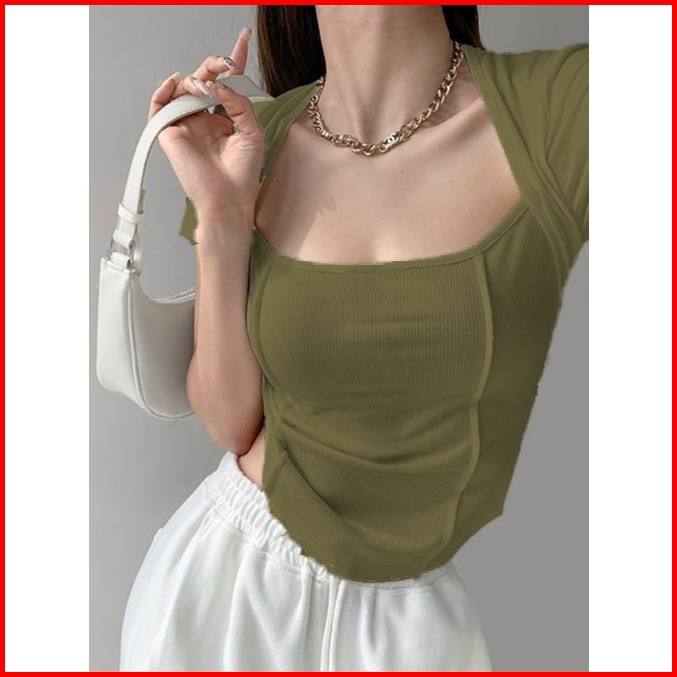 Crop Top Knit Lengan Pendek Square Neck - Square Neck Short Sleeve Crop Top T-shirt 6061