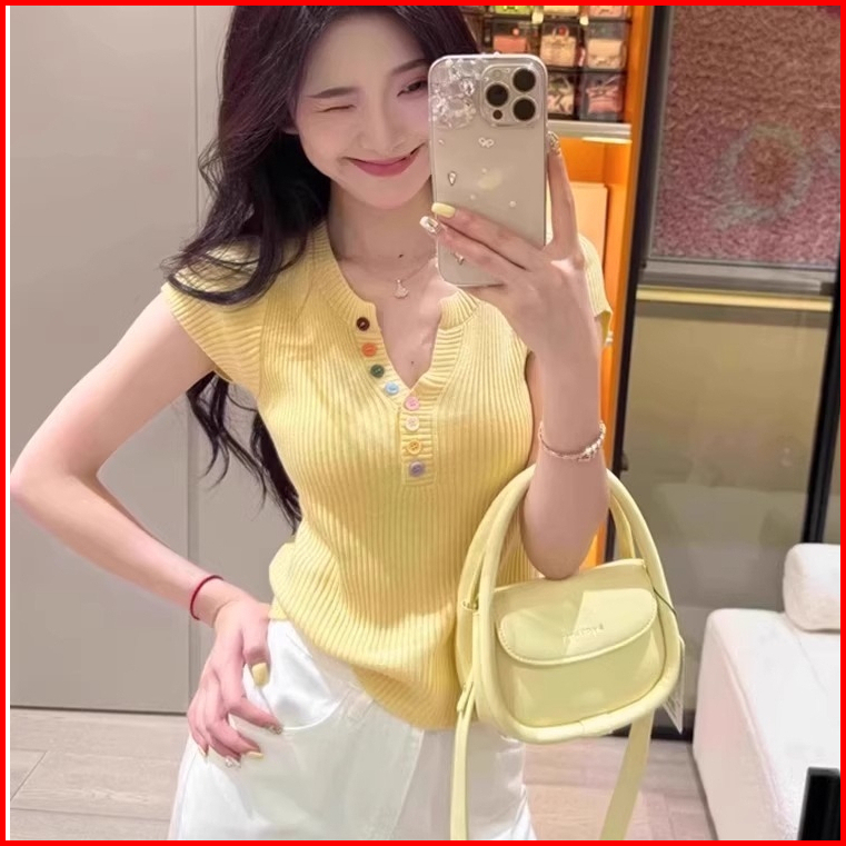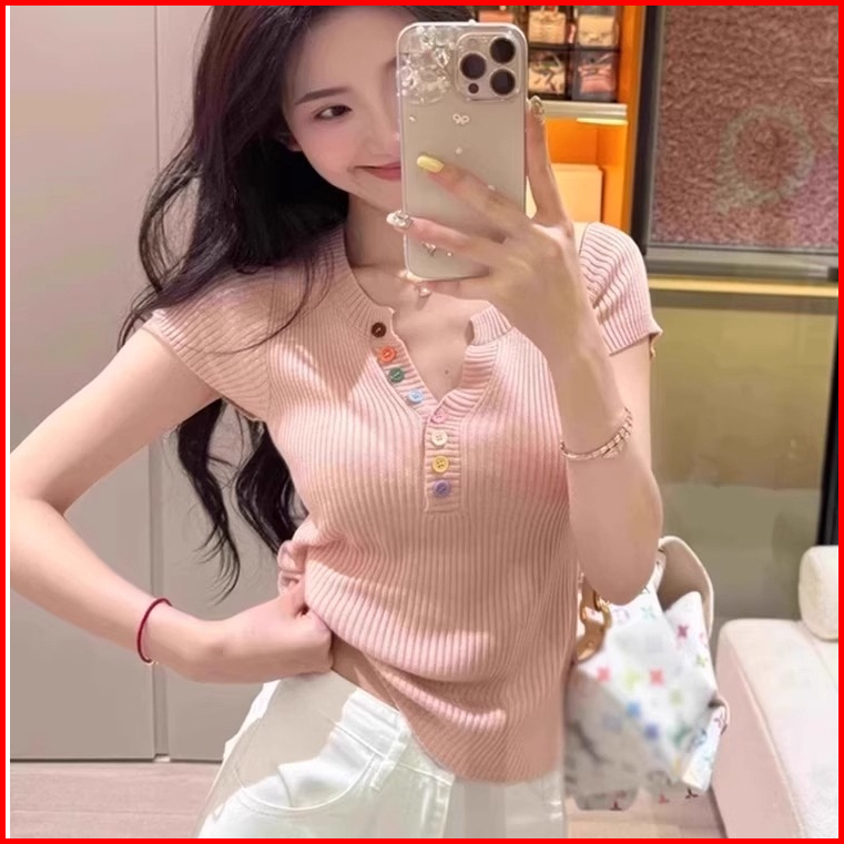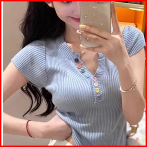 Women S T-shirt Short Sleeve Knitted V Neck Button P010