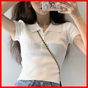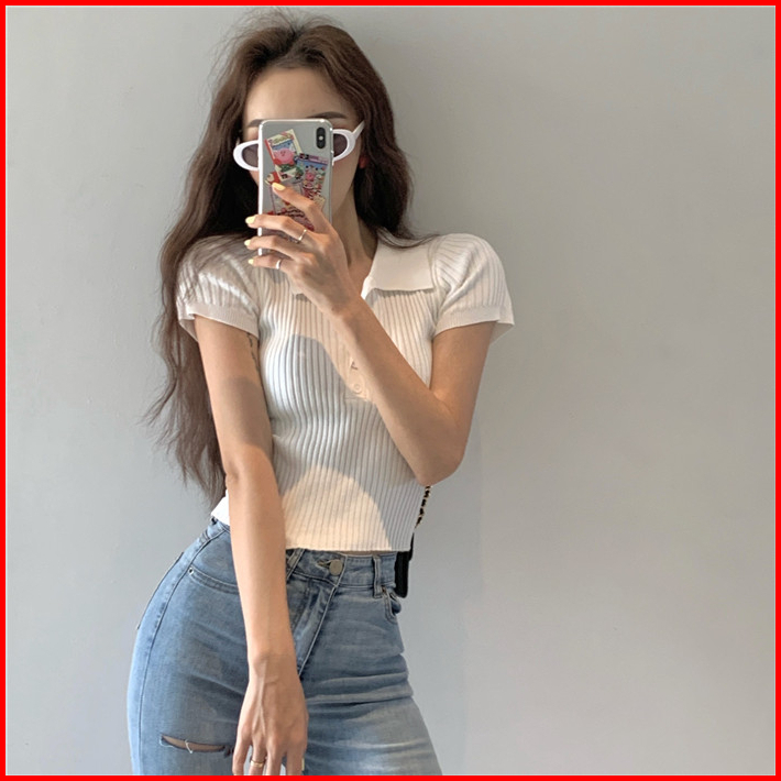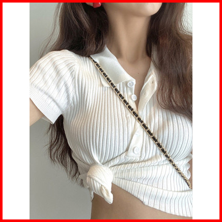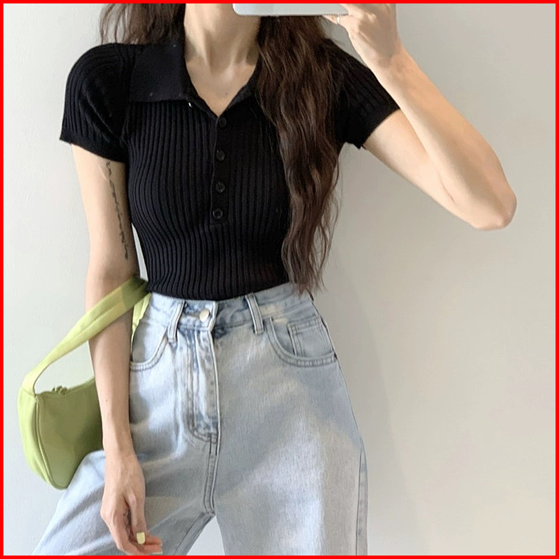 Rib Crop Top Wanita Rajut Kancing Hidup 2290