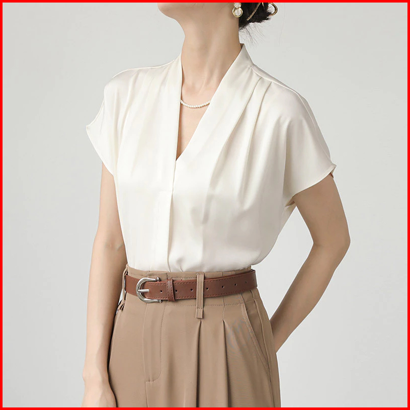 Yuruma Blus Sifon Prancis Wanita Lengan Pendek V-neck Satin