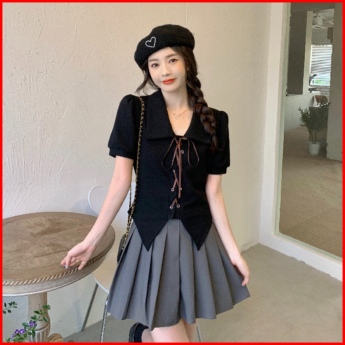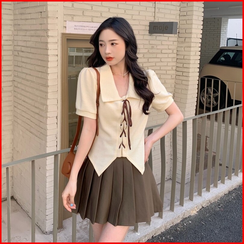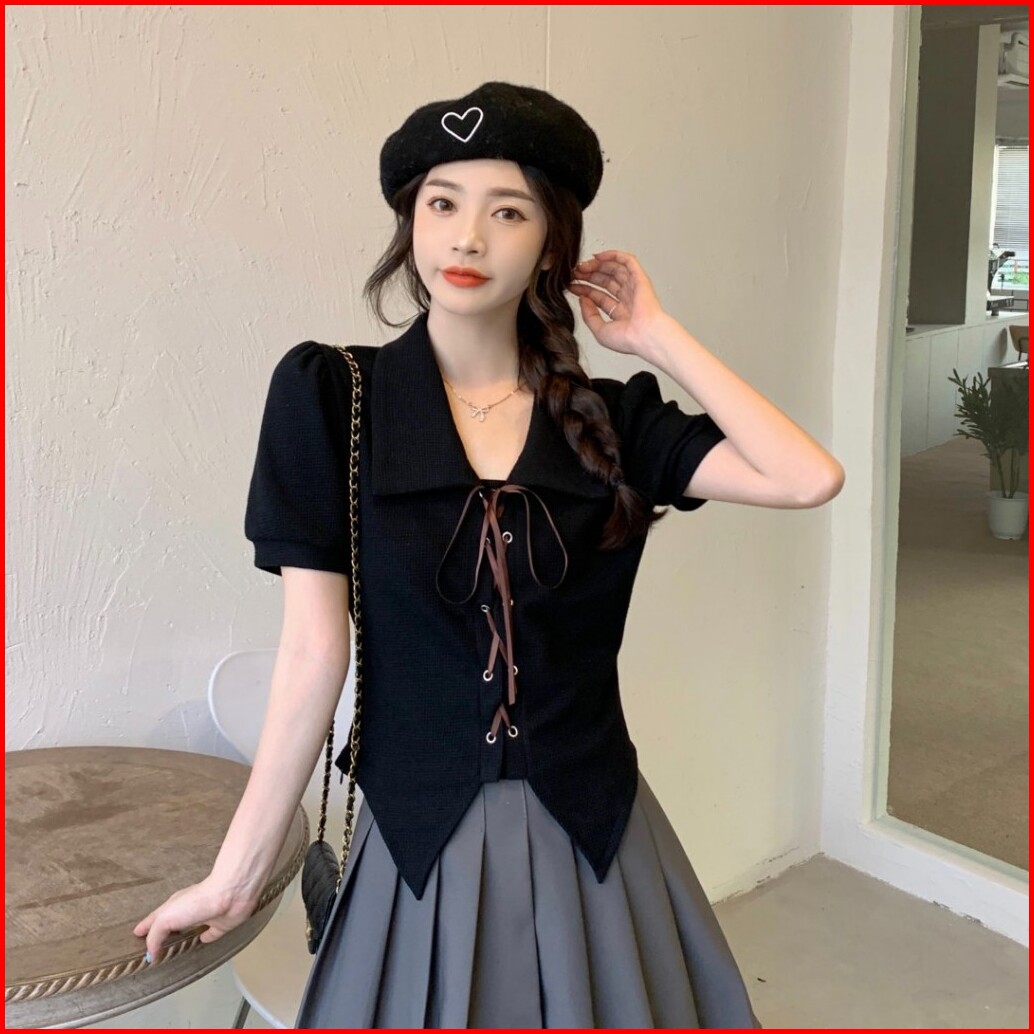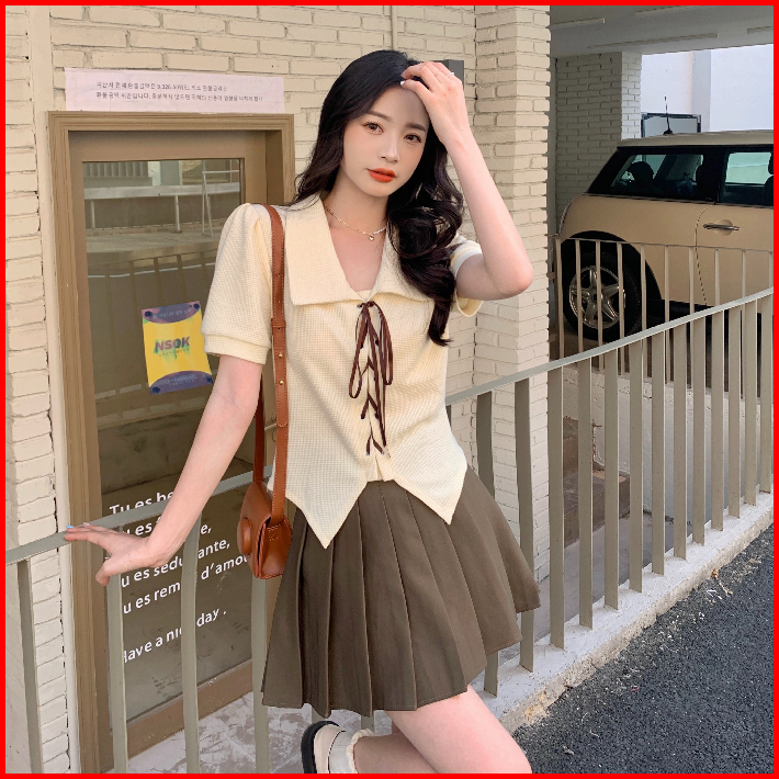 Yuruma Atasan Pendek Berenda Kerah Polo Wafel Yang Dirancang Kemeja T-shirt Lengan Pendek Serbaguna Untuk Pakaian Musim