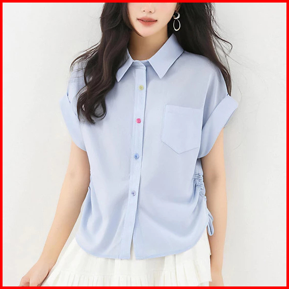 Yuruma Kemeja Polo Kerah Bahu Lengan Pendek Lipat Tali Serut Blus Lengan Pendek Wanita