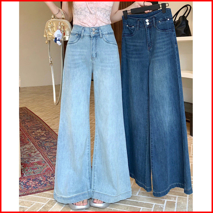 Yuruma Celana Jeans Flared Wanita Korea Ukuran Besar S-6xl Pinggang Tinggi Dengan Kancing Ganda Celana Leg Lebar.