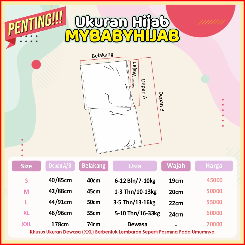 S (6-12 Bulan), M (1-3 Tahun), L (3-5 Tahun), XL (5-10 Tahun), XXL (Dewasa)