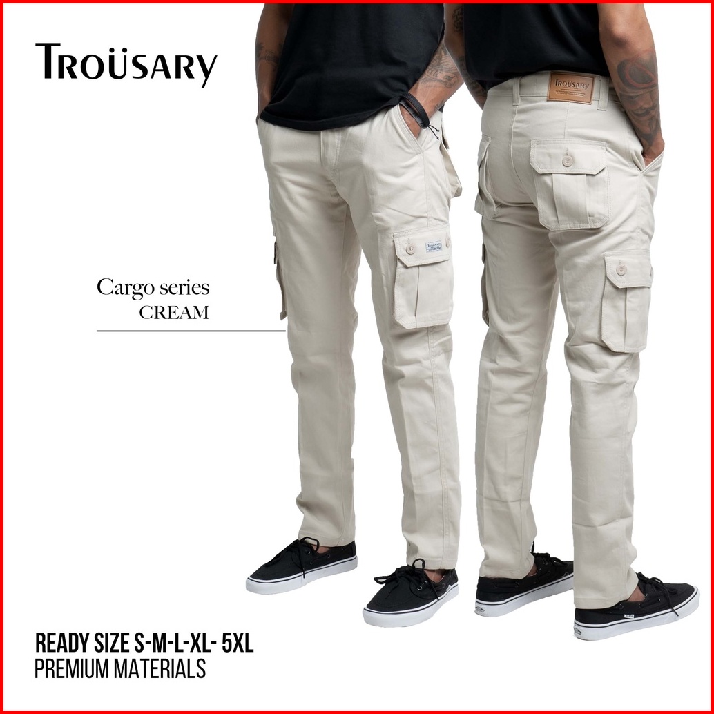 Trousary Celana Cargo Panjang Pria Warna Cream Bahan Premium Size 28 - 42