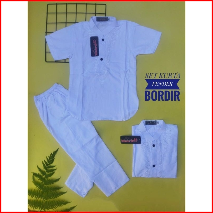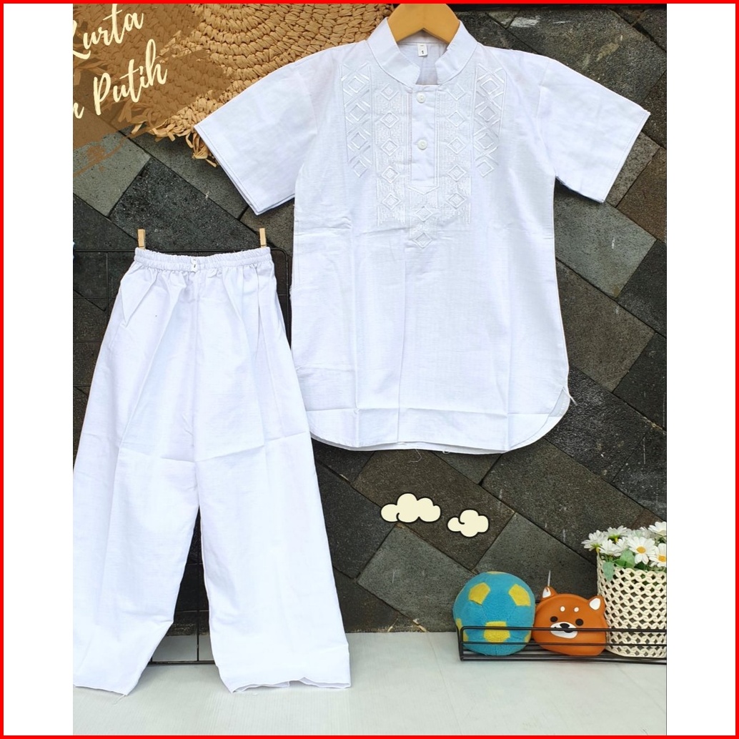 Setelan Koko Pakistan Bordir Putih Lengan Pendek 3-12 Tahun Kurta Koko Pakistan Buat Sholat Jum At Manasik Haji