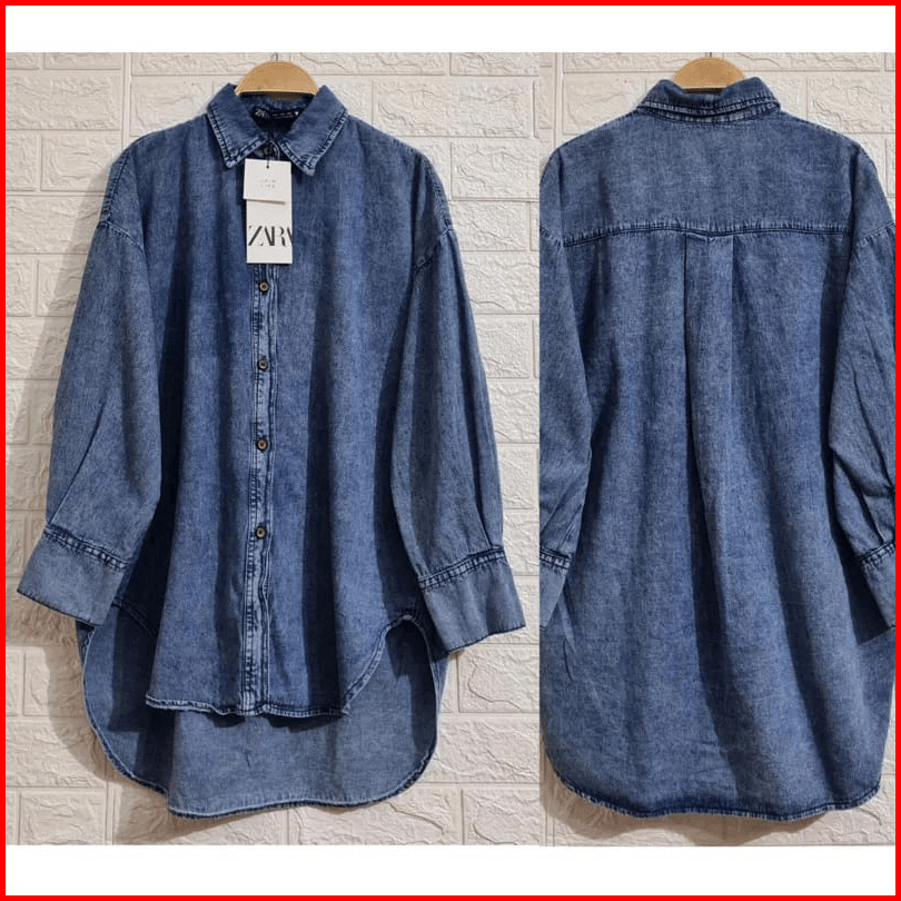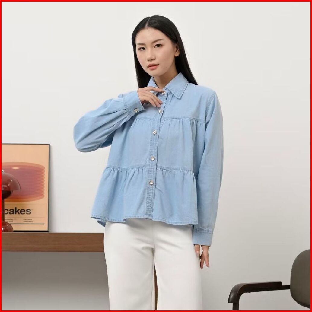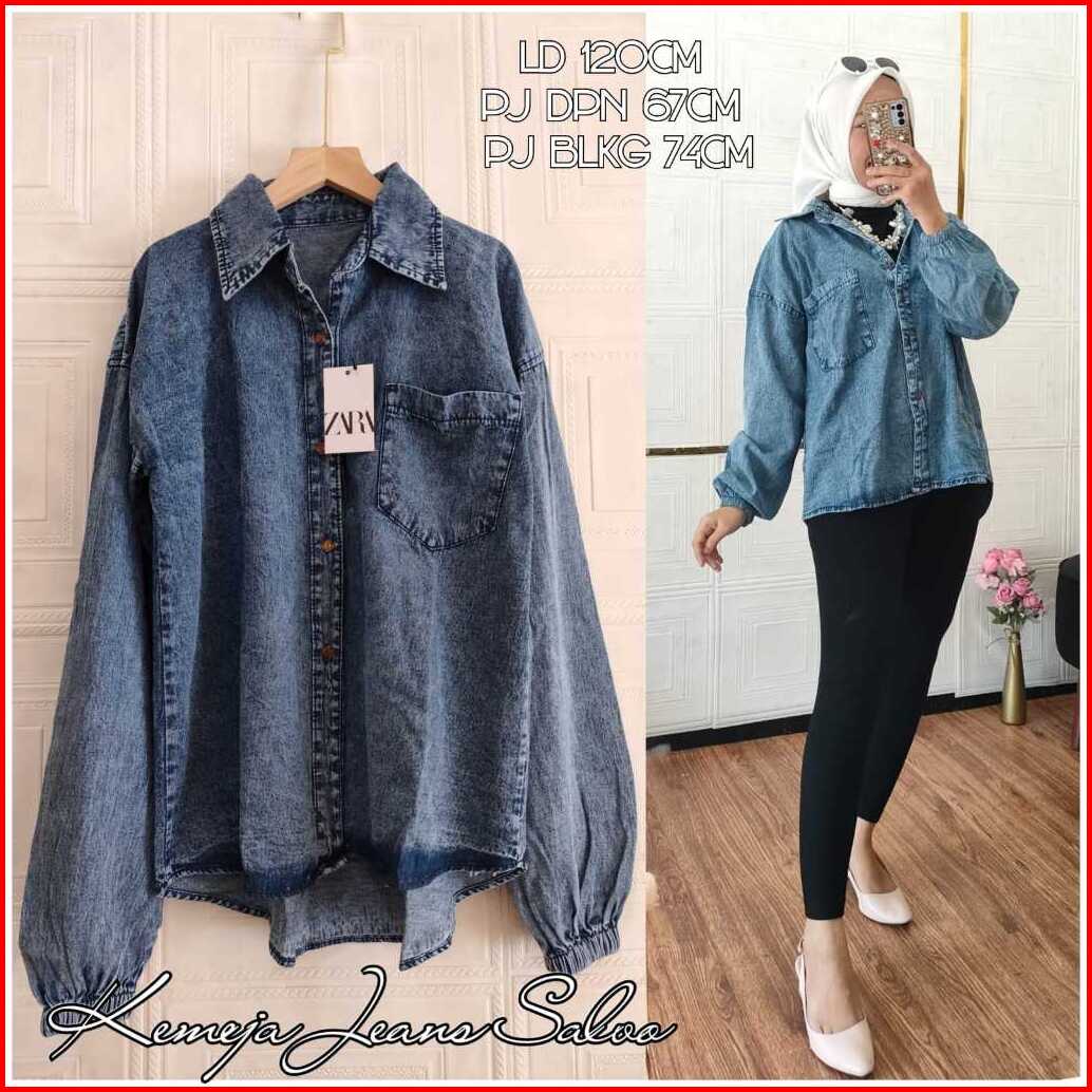 Kemeja Jeans Wanita Lengan Karet Oversize Kemeja Jeans Lengan Karet