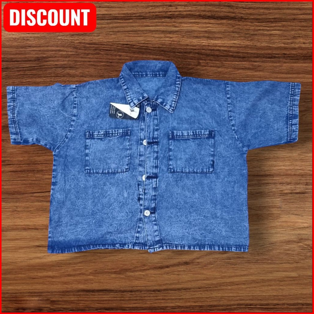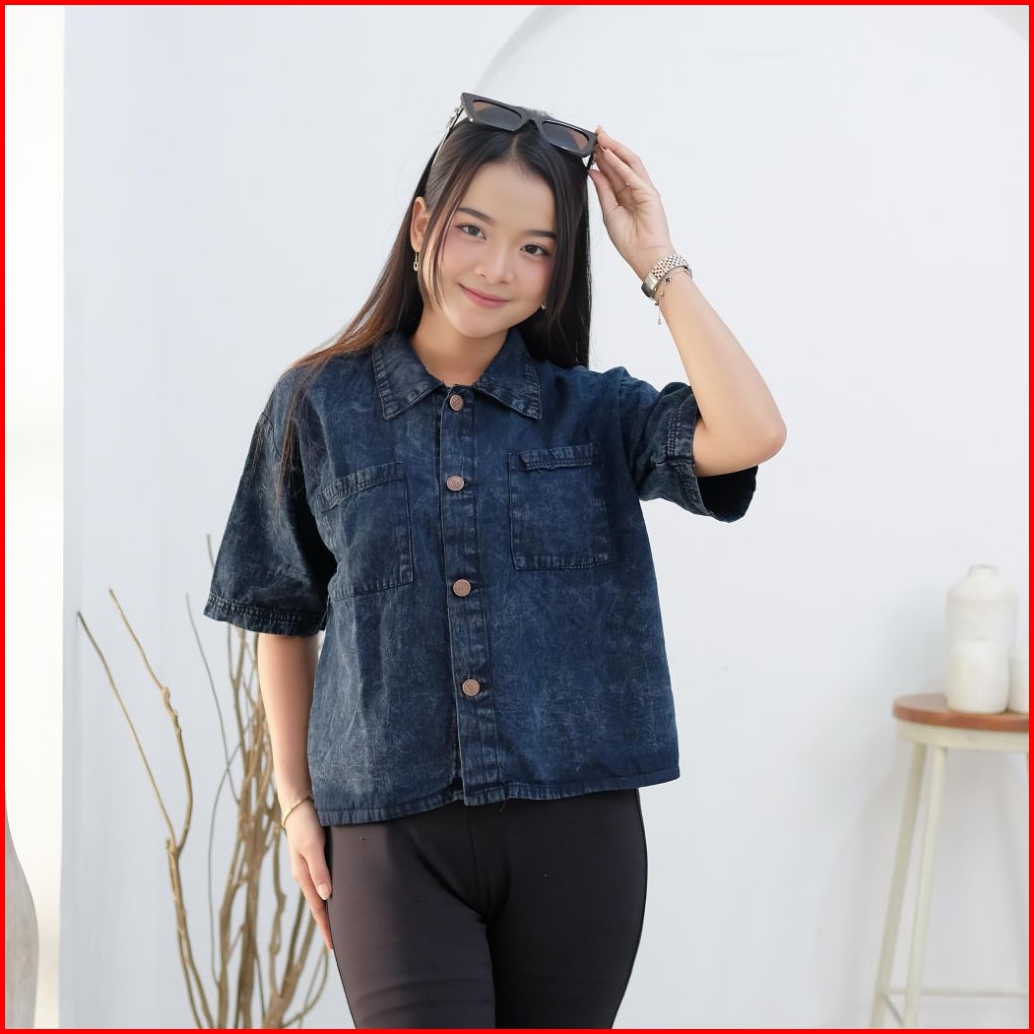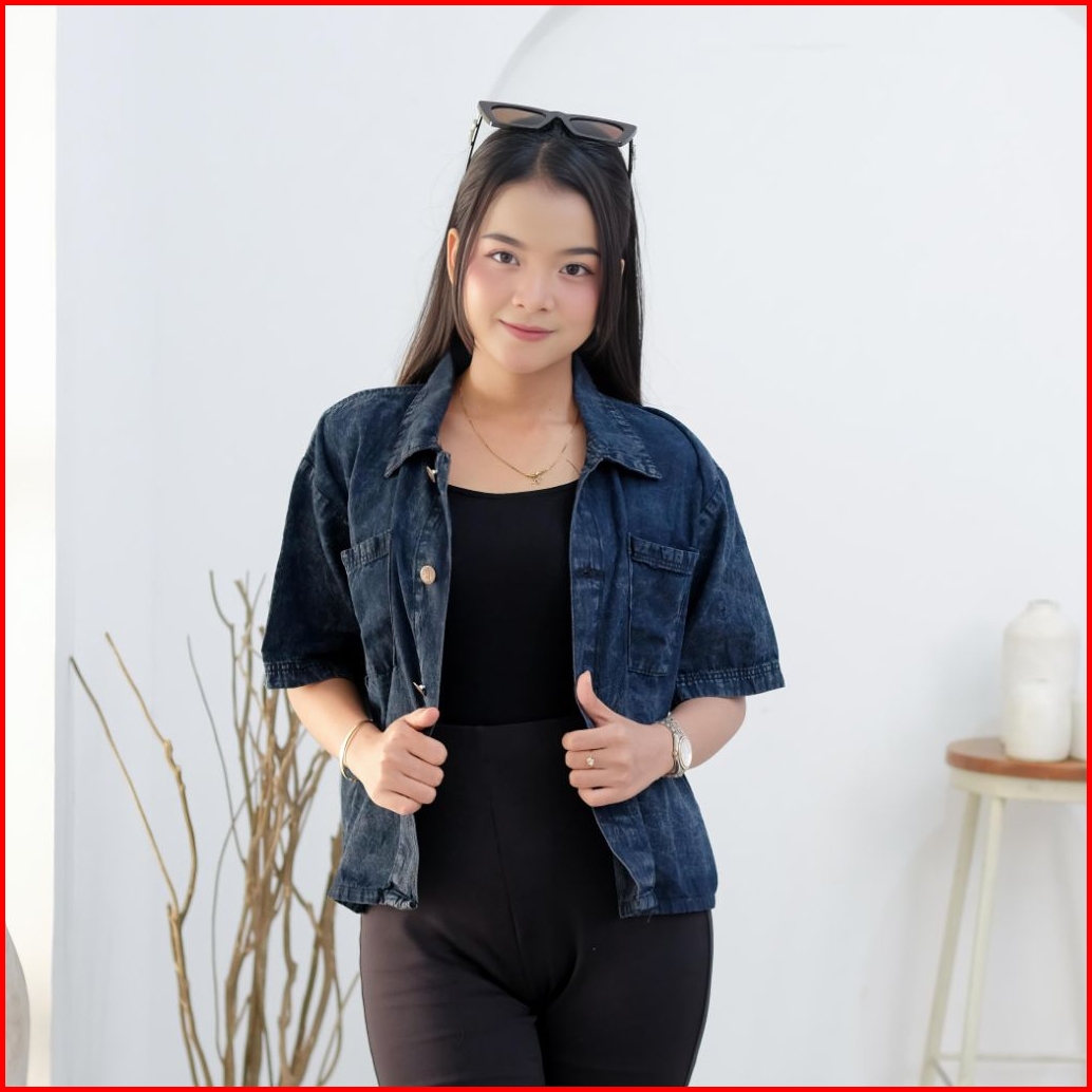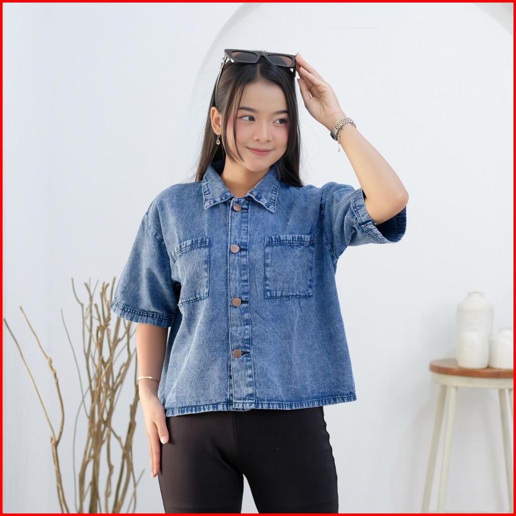 Kemeja Denim Wanita Oversize Casual Kemeja Jeans Cewek Lengan Panjang Leher V Outer Korean Style