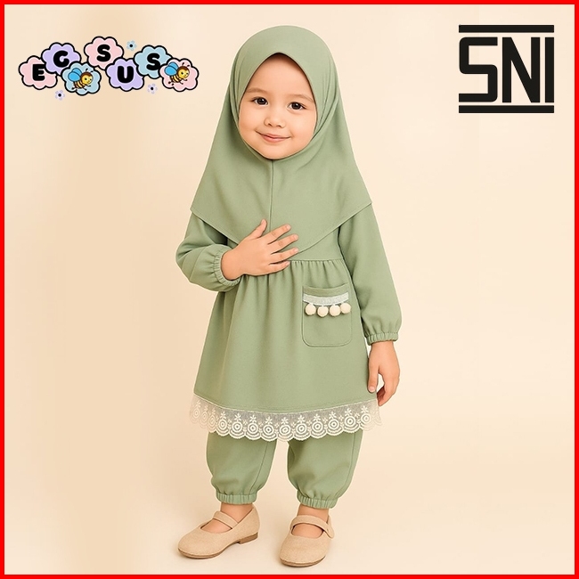 Egsus Setelan Gamis Hijab Alena Bayi Anak Balita Renda Katun Spandek Jersey 0-2 Tahun Pakaian Sage