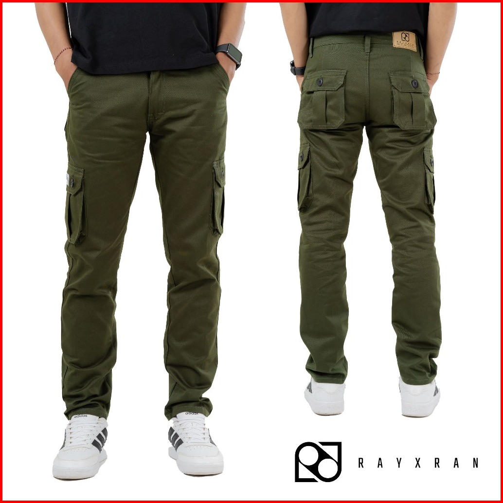 Rayxran Celana Cargo Panjang Pria Basic Outdoor Green Army Slimfit