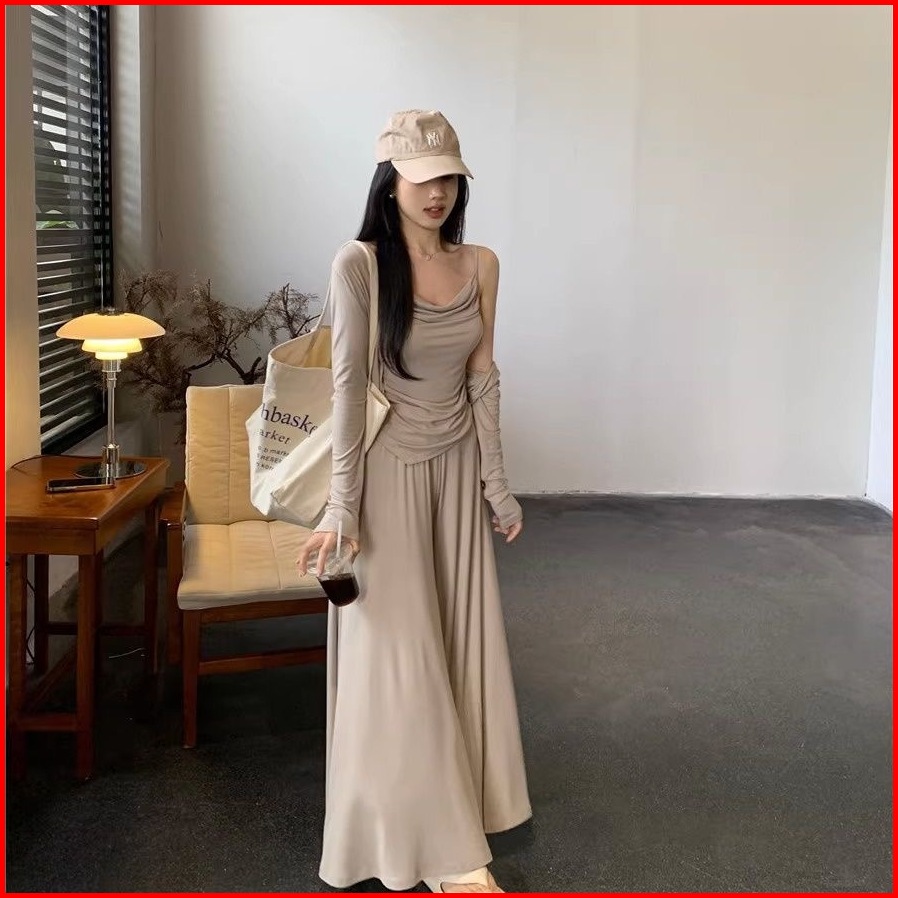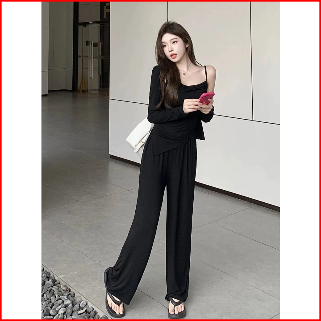 Set Tiga Potong Wanita Strecth Kasual Suspender Lengan Panjang