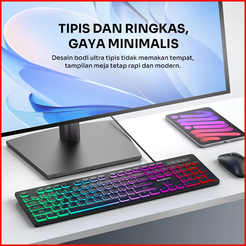 Robot Keyboard Kabel Backlit 7 Warna Ultra Tipis Rgb Keyboard Kantor Senyap Ergonomis Rk40 - Garansi 1 Tahun