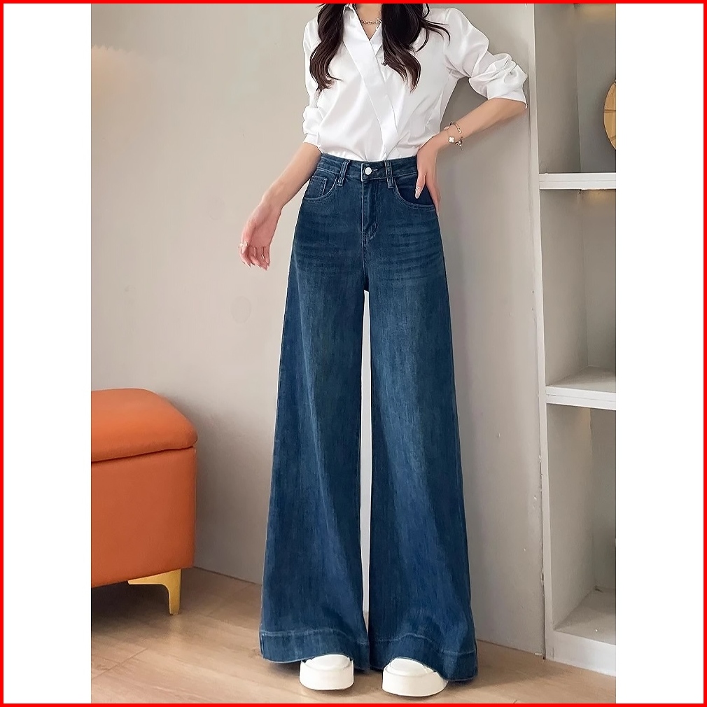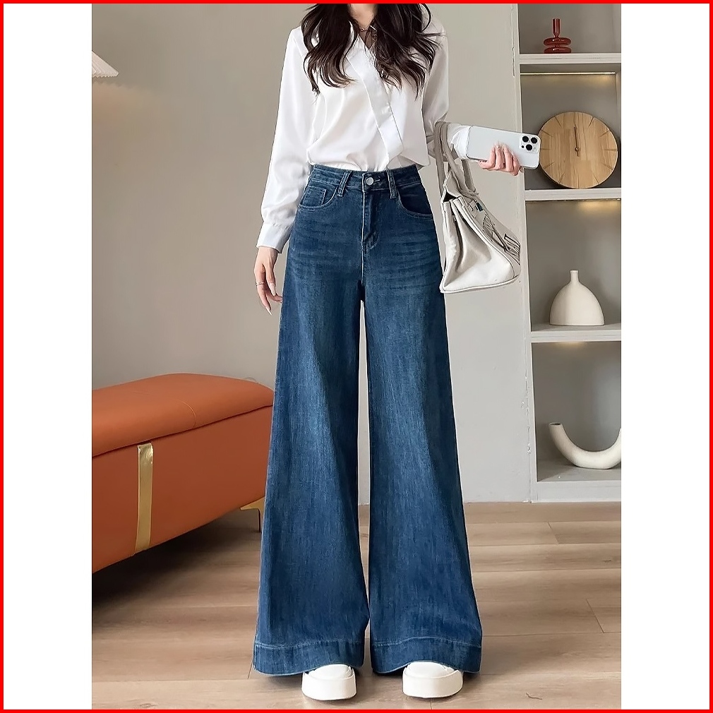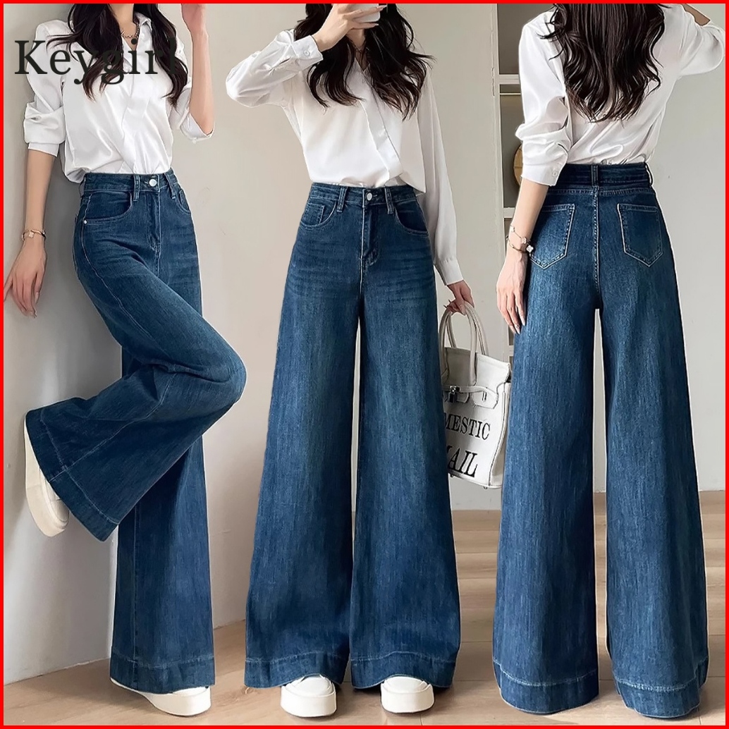 Keygirl Celana Jeans Wanita Baggy Oversize Loose High Waist Wide Leg Korean Look Kekinian Biru Retro