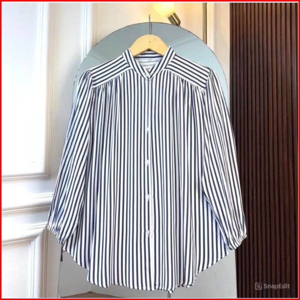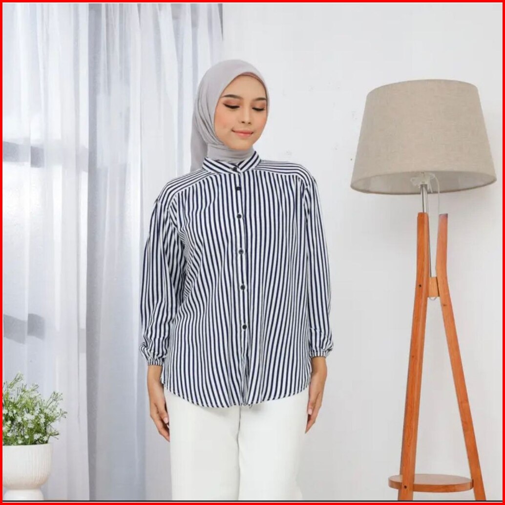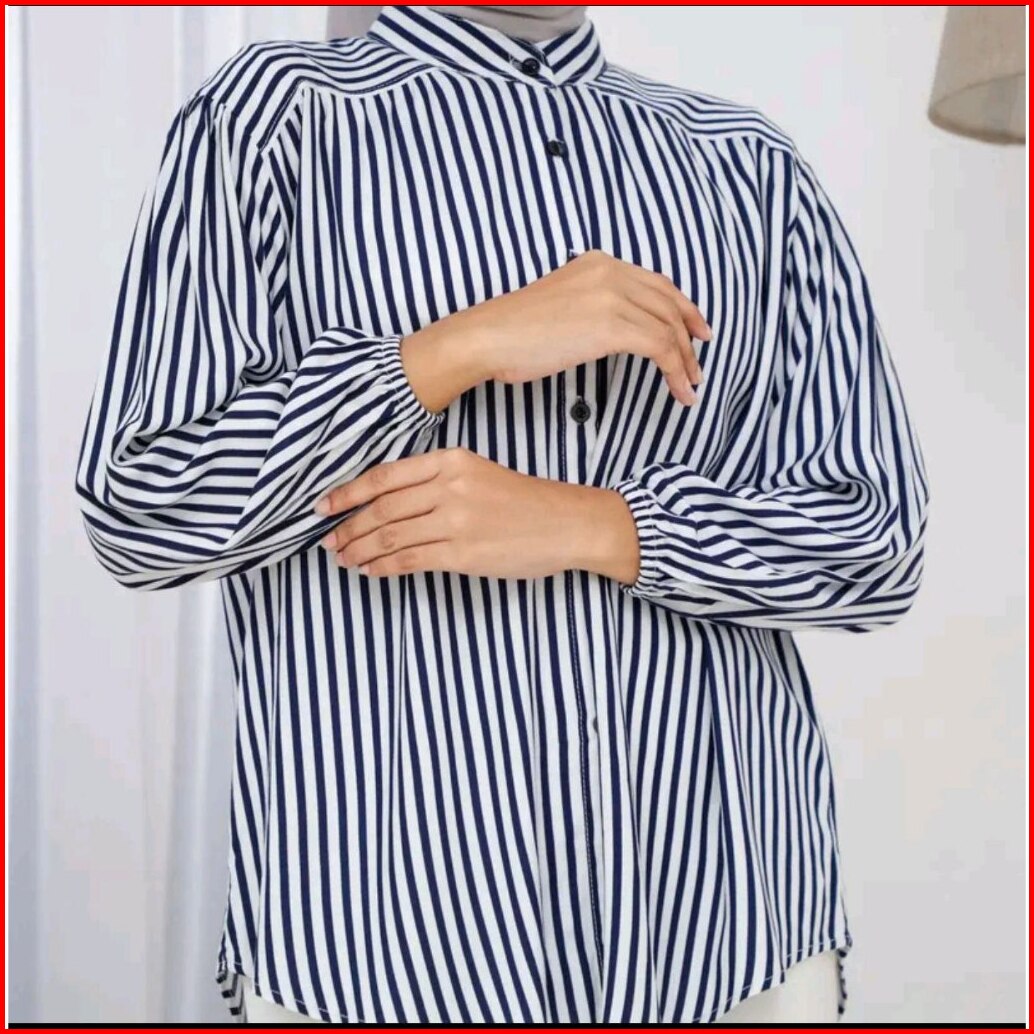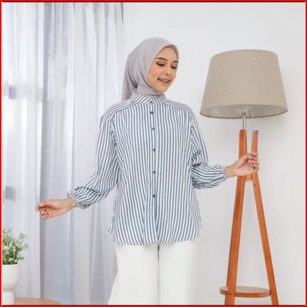 Azura Blouse Salur Atasan Kemeja Wanita Ruffle Garis-garis Rayon Oversize Lengan Panjang